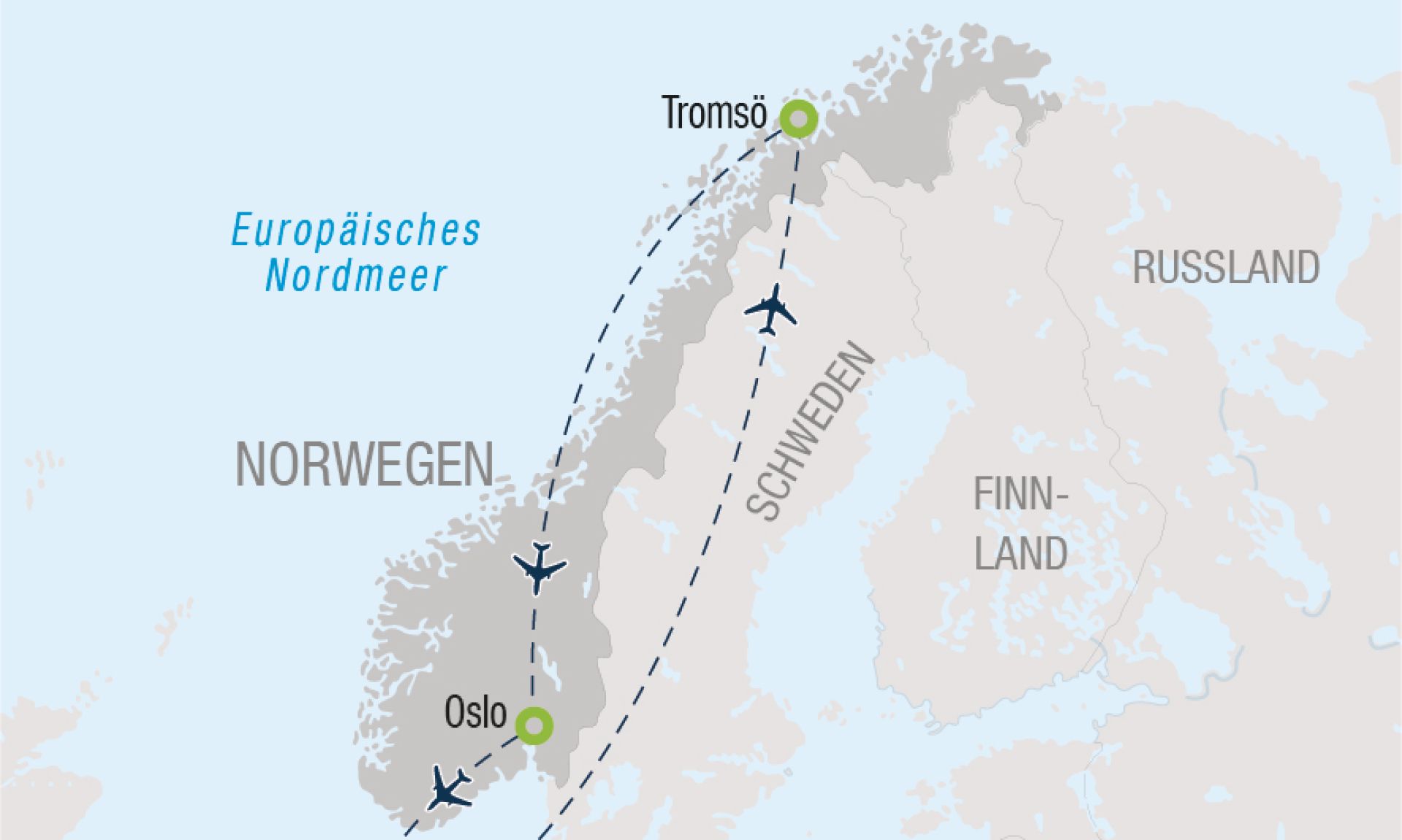 Nach dem Frühstück verlassen Sie die arktische Region und können nochmals das Erlebte der letzten Tage beim Inlandsflug in die norwegische Hauptstadt Revue passieren lassen - Zimmerbezug und Abendessen in Oslo.