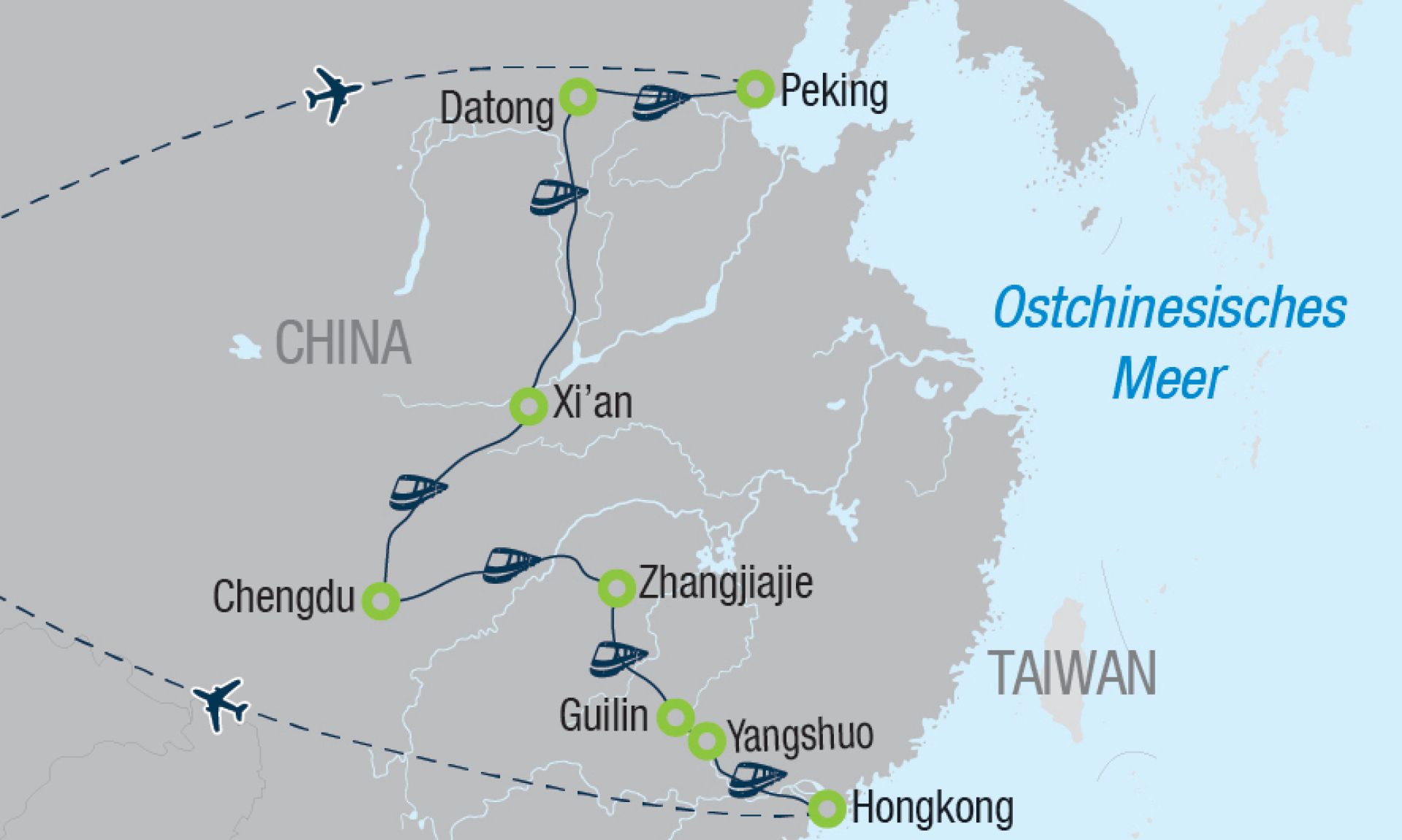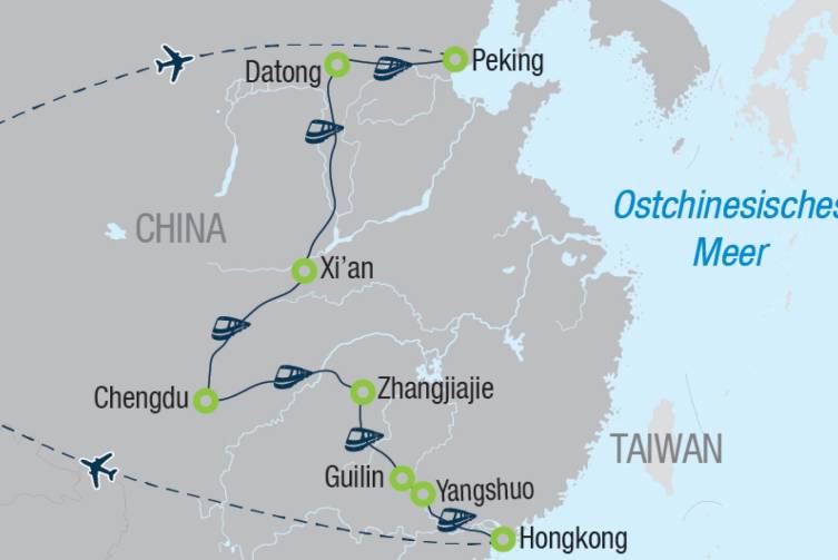 Erkundung der Yungang-Grotten mit rund 51.000 buddhistischen Figuren, ein Meisterwerk der Felskunst - Besuch der spektakulären Hängenden Tempel, die seit 1.500 Jahren in einer Felswand thronen - zurück in Datong besichtigen Sie die farbenprächtige Neun-Drachen-Mauer, die größte ihrer Art in China - gemeinsames Abendessen.