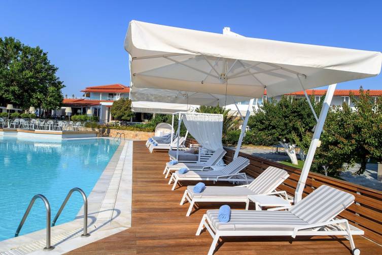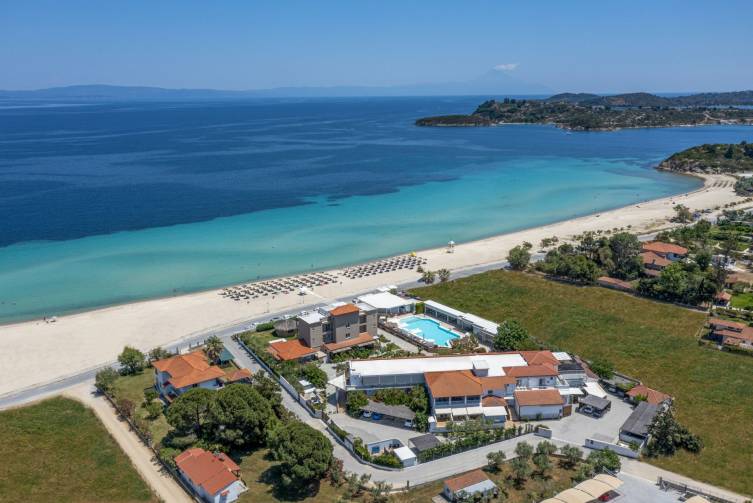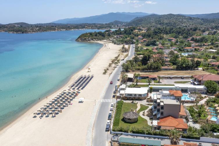 direkt am Strand, der lange Sandstrand "Trani Amouda" ist einer der schönsten und beliebtesten der Sithonia, Strandservice inklusive; Strandbar, Strandtücher kostenlos; Bootsverleih durch Drittanbieter vor Ort.