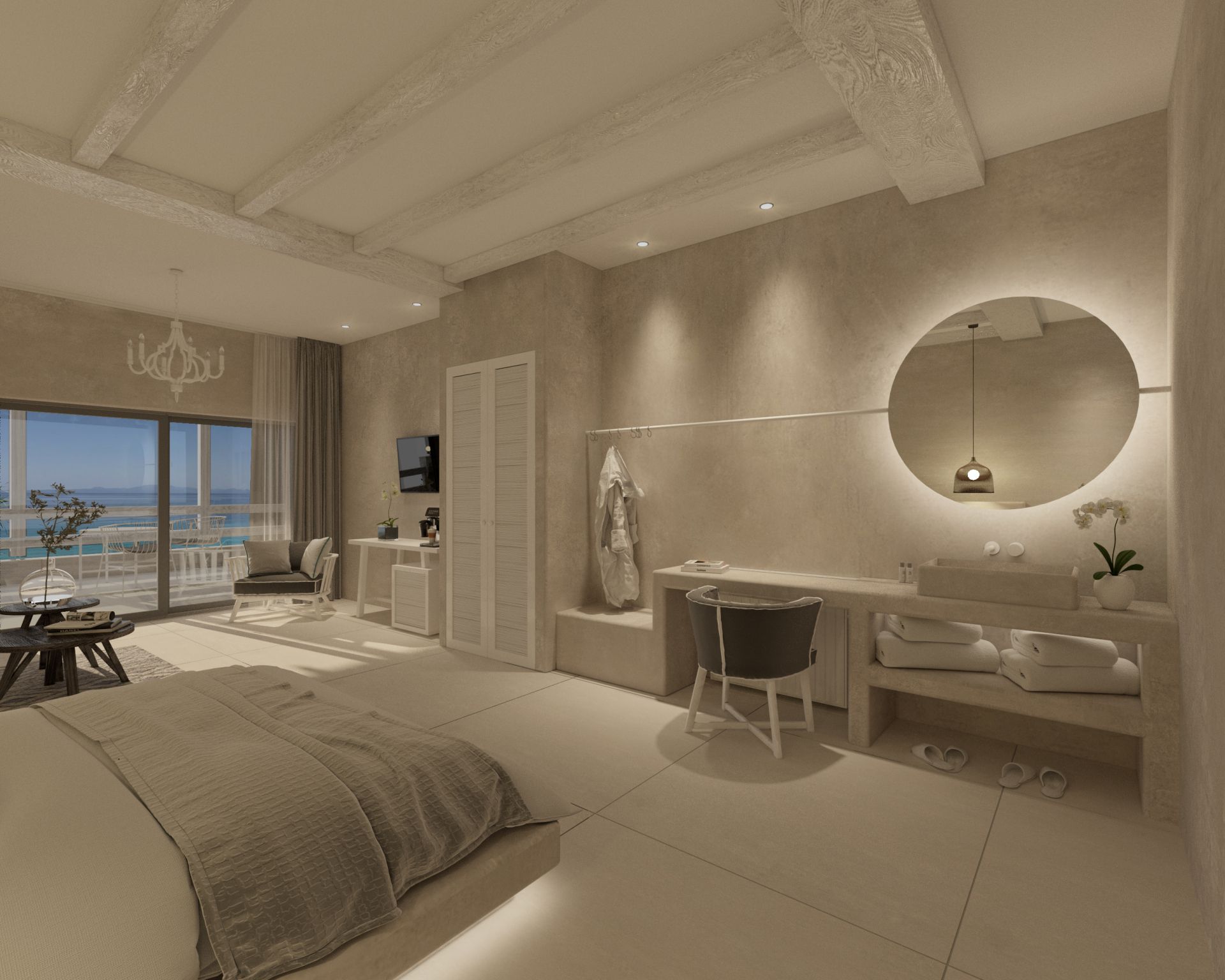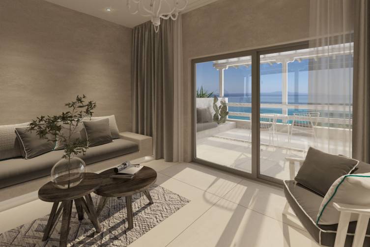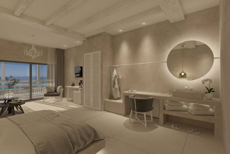 Juniorsuite Superior mit Bad oder Dusche/WC, Bademantel und Slipper, exklusive Pflegeprodukte, Föhn, Klimaanlage, Queen-Size Bett, Sat-TV, Minibar, Safe, Wohnraum (nicht abgetrennt), Kaffee- und Teezubereitungsmöglichkeit, Terrasse mit Meerblick, ca. 30 m²;
