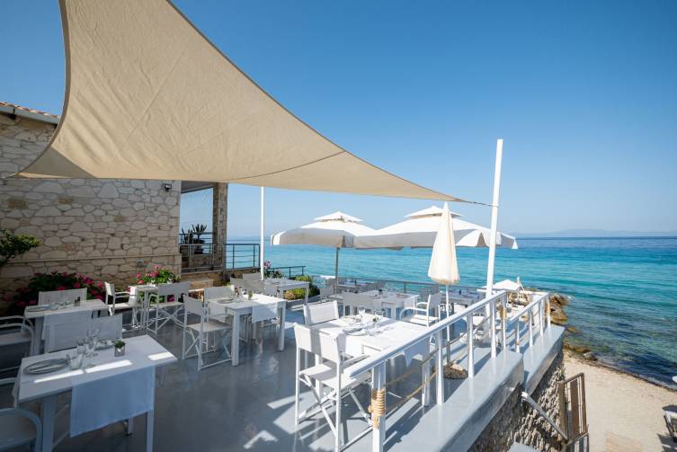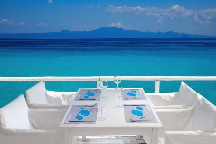 Halbpension: Frühstück in Buffetform, amerikanisch, zusätzlich griechische Gerichte, lokale Produkte; Abendessen im Moudounou Restaurant auf der Terrasse mit Meerblick, 3-Gang Wahlmenü, griechische Küche mit vielen lokalen Produkten, Fisch und Meeresfrüchte; gegen Aufpreis kann man ein romantisches Candlelight-Dinner direkt am Strand buchen.