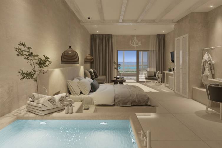 Suite Meerblick alle im Erdgeschoss, bei gleicher Ausstattung wie die Juniorsuiten, Schlafzimmer, offener Wohnbereich, Balkon, Meerblick, ca. 50 m², bei Anreise eine Flasche Wein und eine Flasche Wasser im Zimmer;