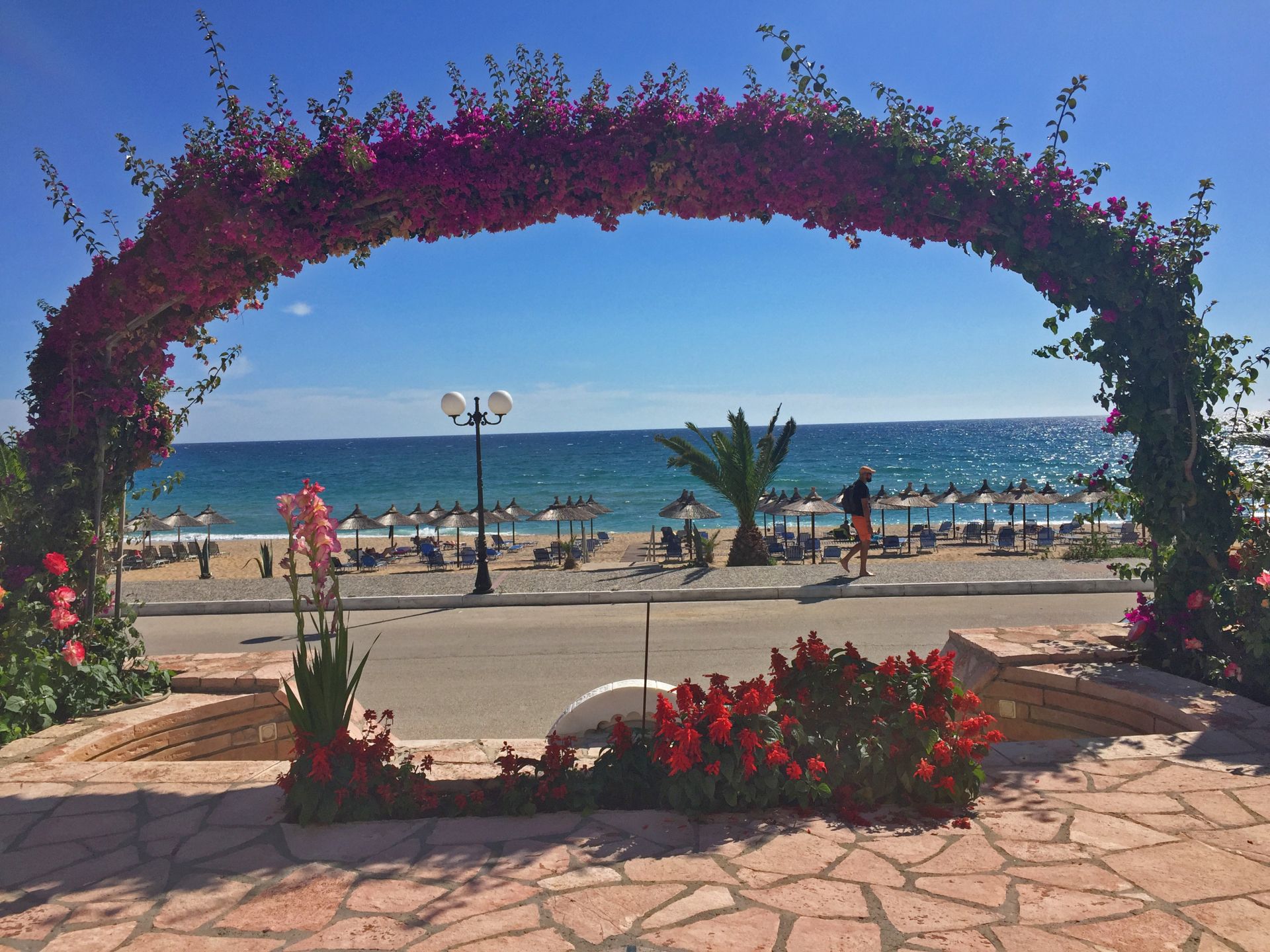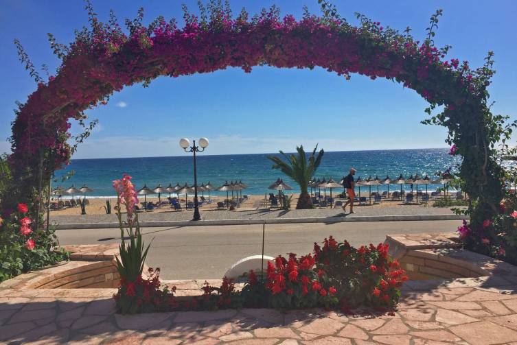 direkt am Strand, nur durch Straße getrennt; 4 km langer feiner kieseliger Sandstrand; 2 Liegen und 1 Sonnenschirm pro Zimmer inklusive; am Strand wird auch Getränkeservice vom Hotel geboten; keine Strandtücher verfügbar; Wassersportmöglichkeiten am Strand von Vrachos, Details unter