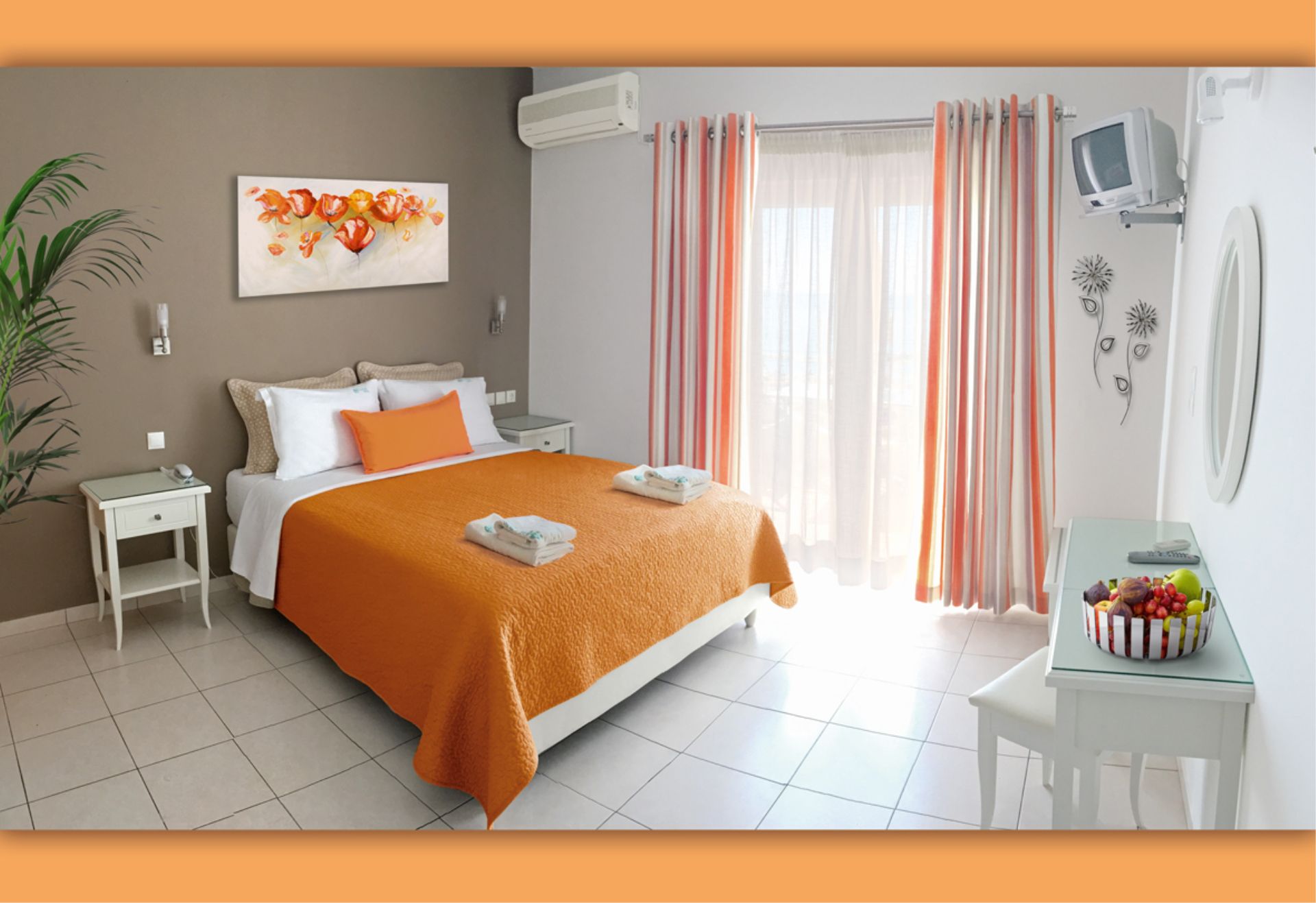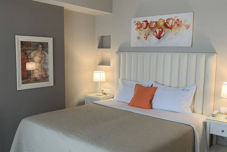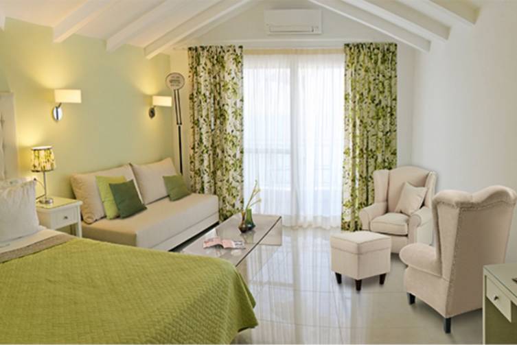 Familienzimmer modern eingerichtet, geräumig, Bäder mit Dusche/WC, Kochgelegenheit mit Kühlschrank, Sat-TV, Klimaanlage (inklusive), Balkon, kombinierter Wohn-/Schlafraum mit 2 Betten und ein weiteres 2-Bett-Schlafzimmer durch Schiebetür getrennt, alle mit direktem Meerblick, ca. 35 m²;