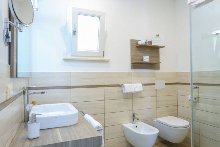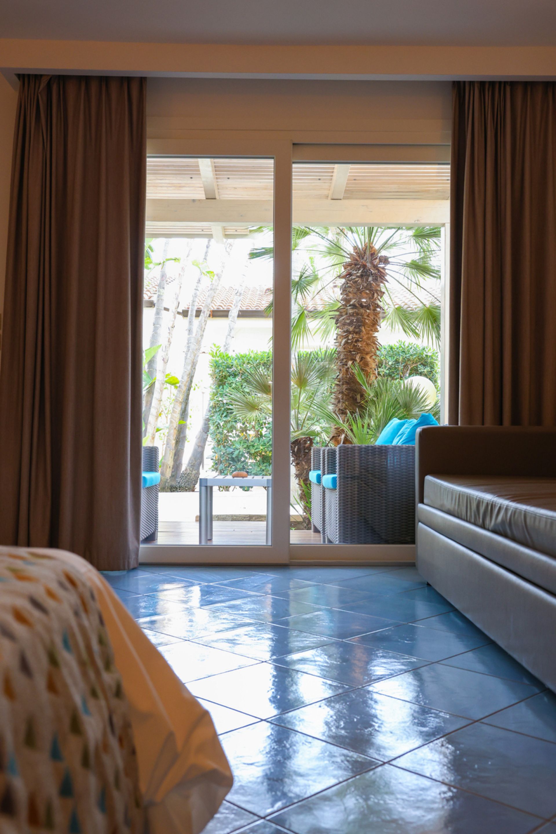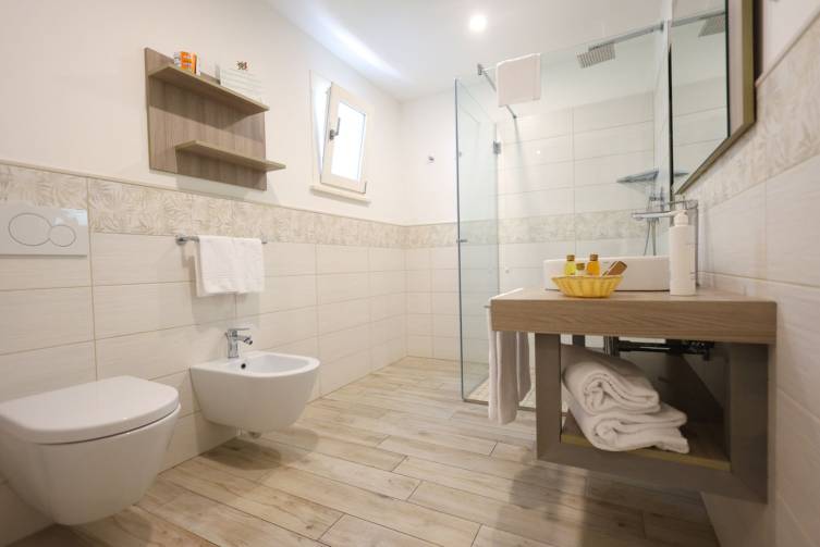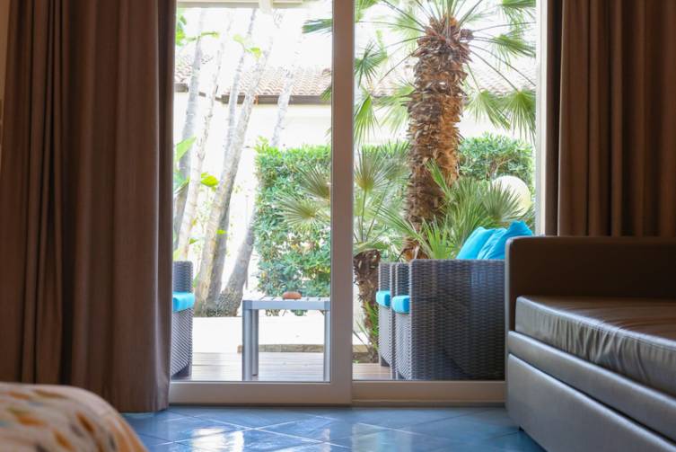 Doppelzimmer Comfort komfortabel und elegant eingerichtet, Bad mit Dusche/WC (Schiebetür), Föhn, Mini-Kühlschrank, Sat-TV, Telefon, Safe, Klimaanlage, W-Lan, ausziehbares Sofa, Balkon oder Terrasse mit Gartenblick; ca. 25-30 m²;