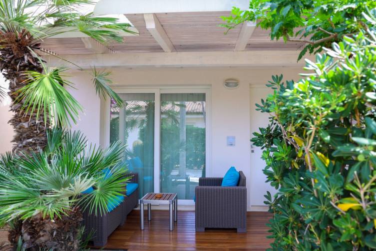 Juniorsuite bei gleicher Ausstattung, aber zusätzlich durch Schiebetür abgetrennte Schlafzimmer, Wohnraum mit ausziehbarem Schlafsofa; ca. 35-40 m²; Kinder ab 5 Jahren erlaubt.