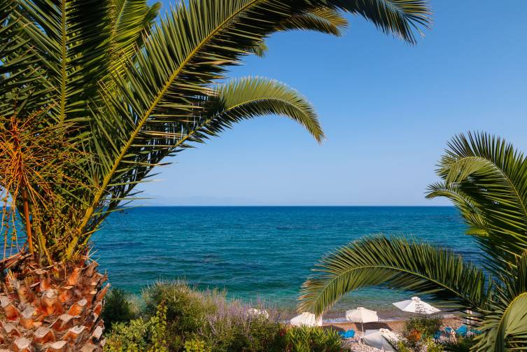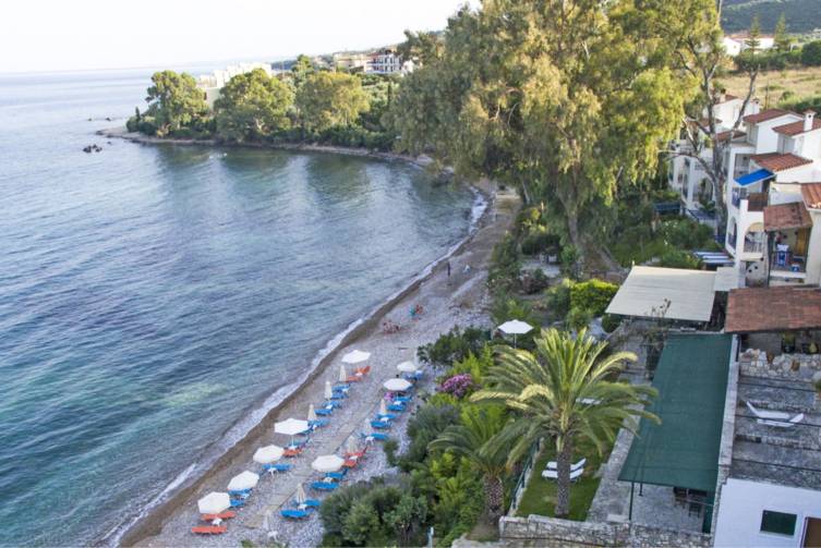 direkt am Strand, grobkieselig; Liegen und Sonnenschirme inklusive, keine Strandtücher im Hotel.