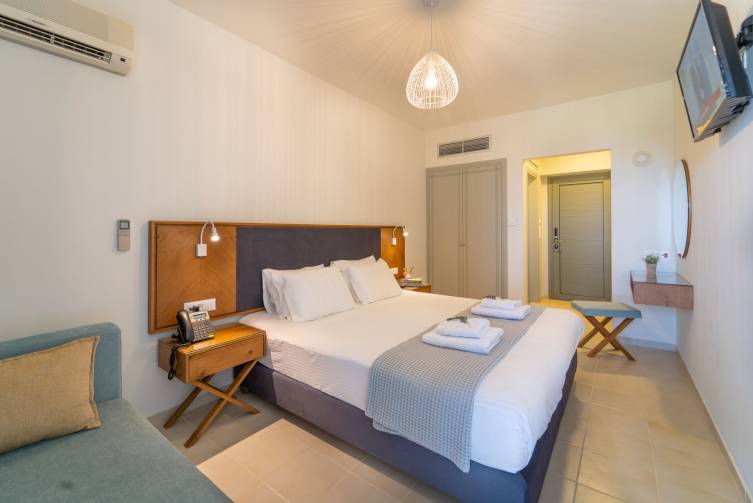 Doppelzimmer Meerblick komplett renoviert, mit Dusche/WC, Klimaanlage, Kühlschrank, Safe, Sat-TV, Schreibtisch, Balkon oder Terrasse mit Blick auf Methoni und das Meer, ca. 20m²;
