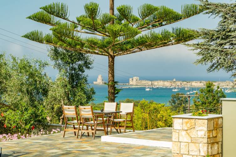 in Hanglage mit traumhaftem Ausblick über Methoni, Panoramablick auf die Burg von Methoni und auf das türkisblaue Meer; Transfer Flughafen - Hotel ca. 60 min.