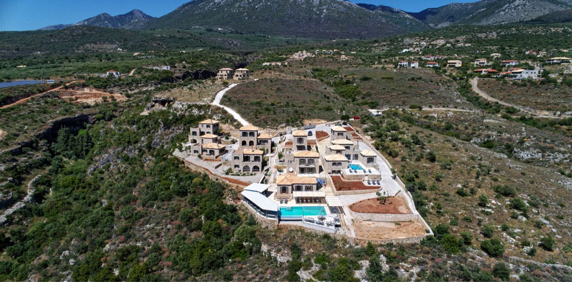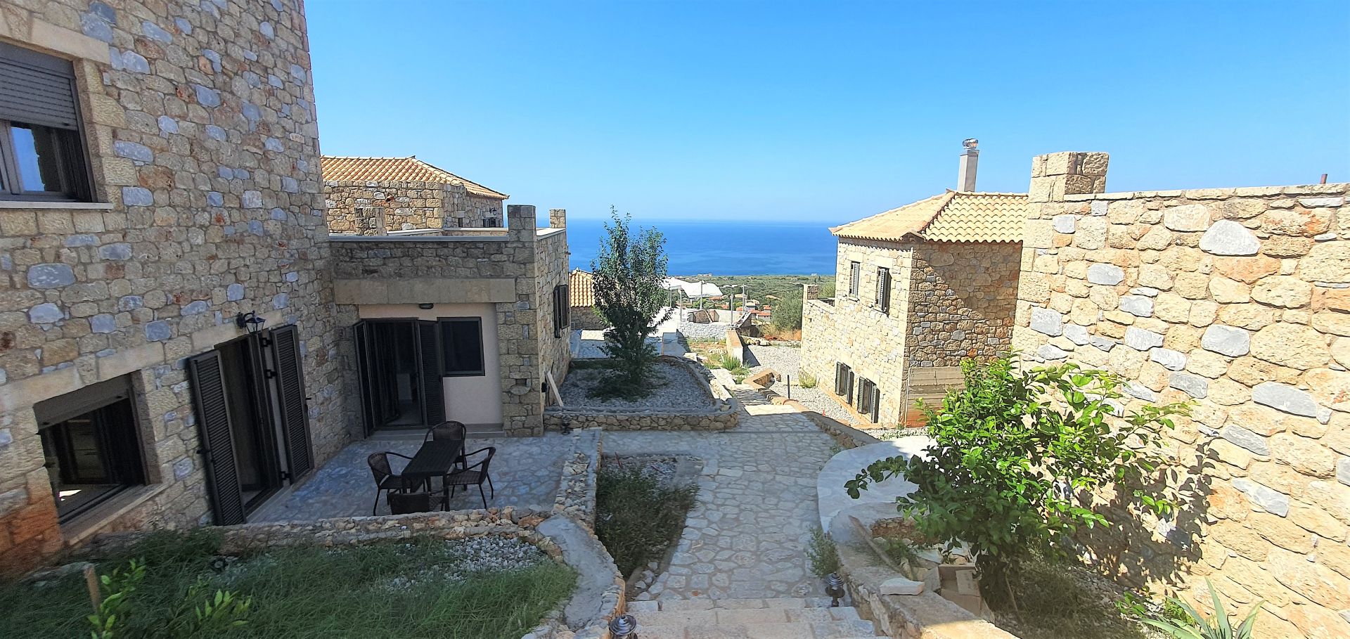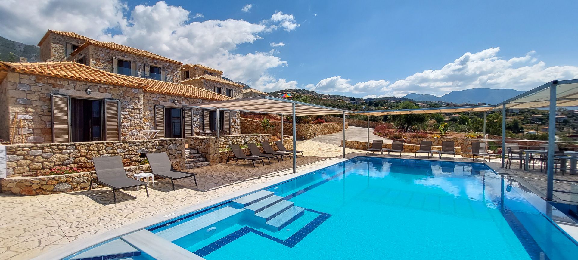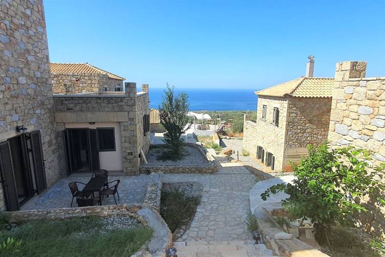 2021 erbaut, 9 Gebäude, alle im landestypischen Stil der Mani aus Naturstein, Rezeption, Infinity-Pool, Liegen und Sonnenschirme inklusive, Poolhandtücher vorhanden (Wechsel 1x pro Woche), Poolbar, Parkplatz und W-Lan kostenlos.