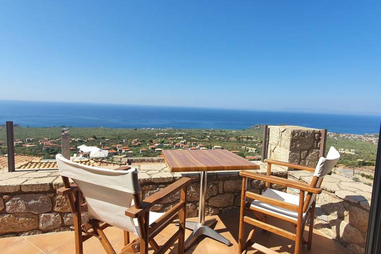 in Hanglage mit traumhafter Aussicht; ca. 2 km von Stoupa und 10 km von Kardamili entfernt - mit dem inkludierten Mietauto gut erreichbar; Transfer Flughafen - Hotel ca. 70 min im Mietauto.