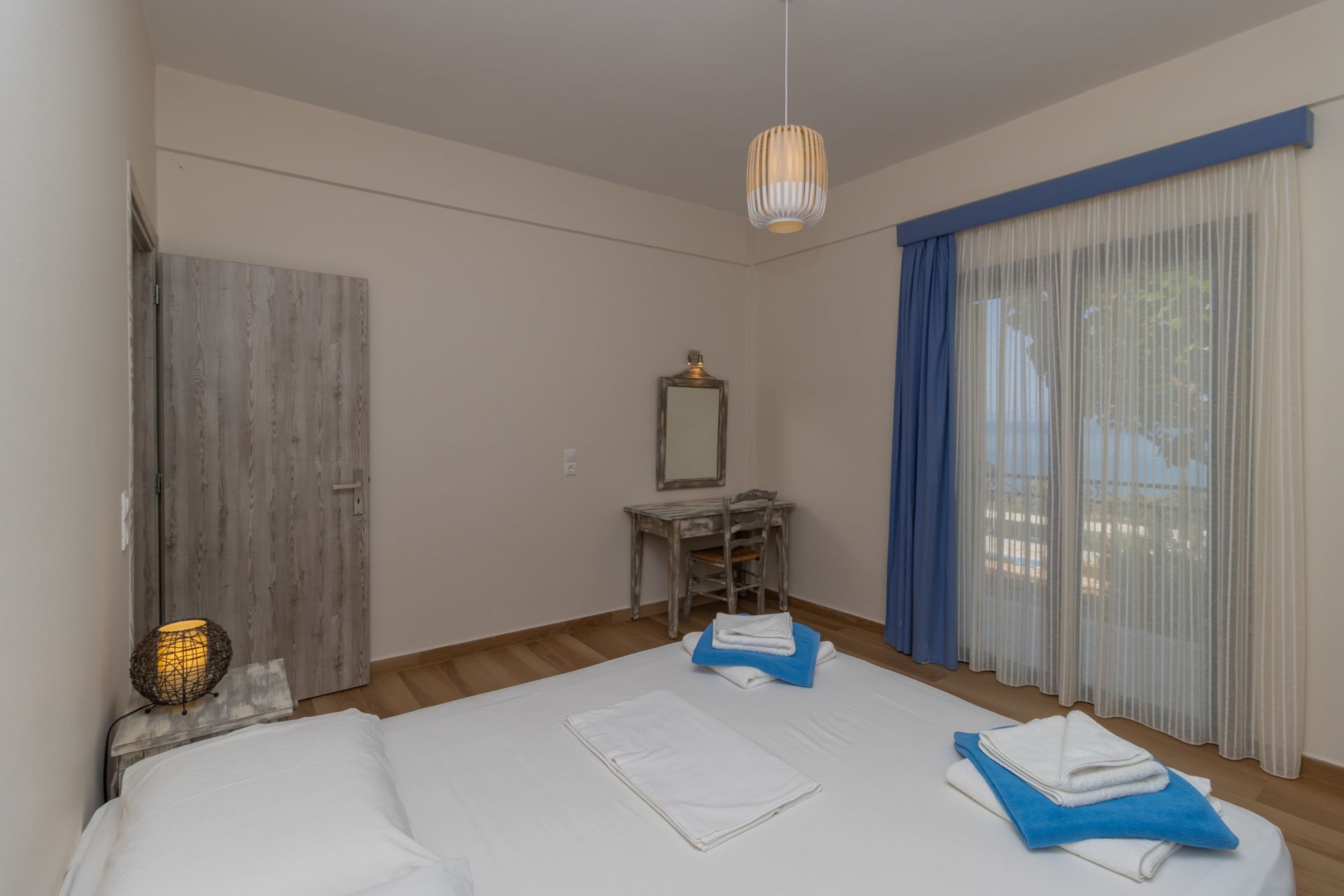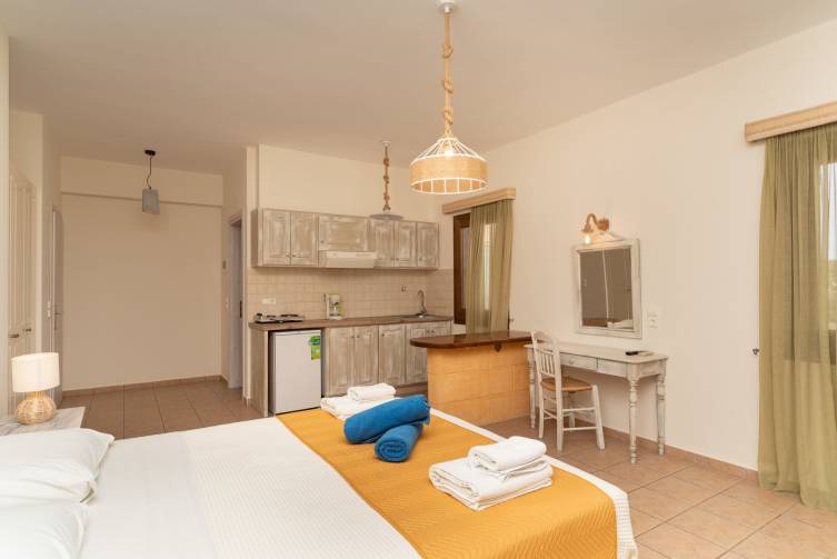 13; alle individuell eingerichtet: Studio mit Bad oder Dusche/WC, Klimaanlage, Kitchenette, Kaffeemaschine, Balkon und Meerblick, ca. 30m²; Appartement bei gleicher Ausstattung mit zusätzlich abgetrennten Wohn-/Schlafraum, ca. 40m²; Kinder bis 1,9 Jahre kostenlos.