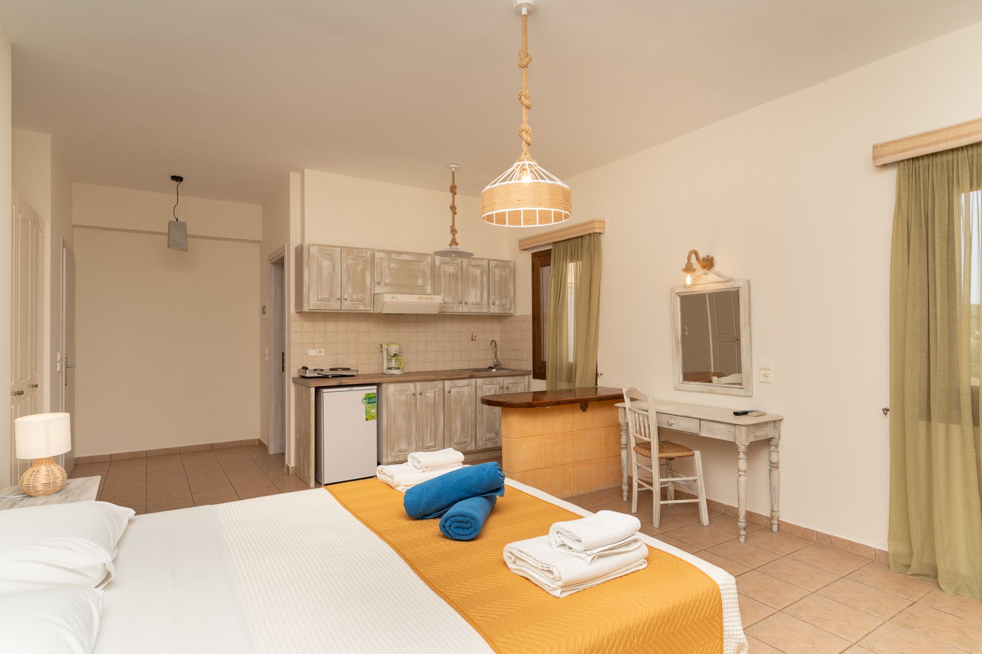 13; alle individuell eingerichtet: Studio mit Bad oder Dusche/WC, Klimaanlage, Kitchenette, Kaffeemaschine, Balkon und Meerblick, ca. 30m²; Appartement bei gleicher Ausstattung mit zusätzlich abgetrennten Wohn-/Schlafraum, ca. 40m²; Kinder bis 1,9 Jahre kostenlos.