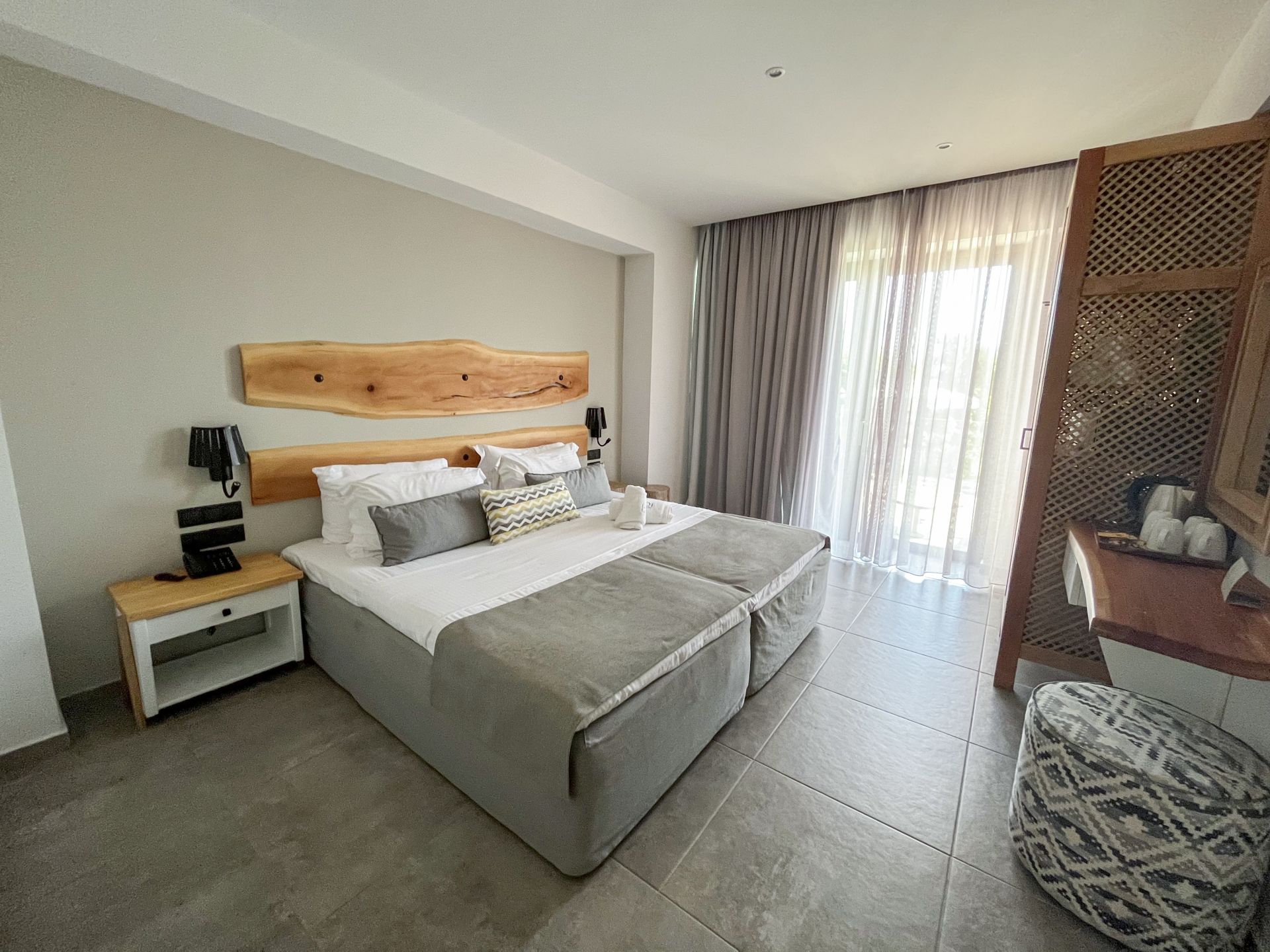 Familienzimmer Superior bei gleicher Ausstattung, 1 Schlafzimmer mit Doppelbett, ein zusätzliches Schlafzimmer mit zwei Einzelbetten, 1 Badezimmer mit Dusche, Balkon und Meerblick, ca. 30 m²;