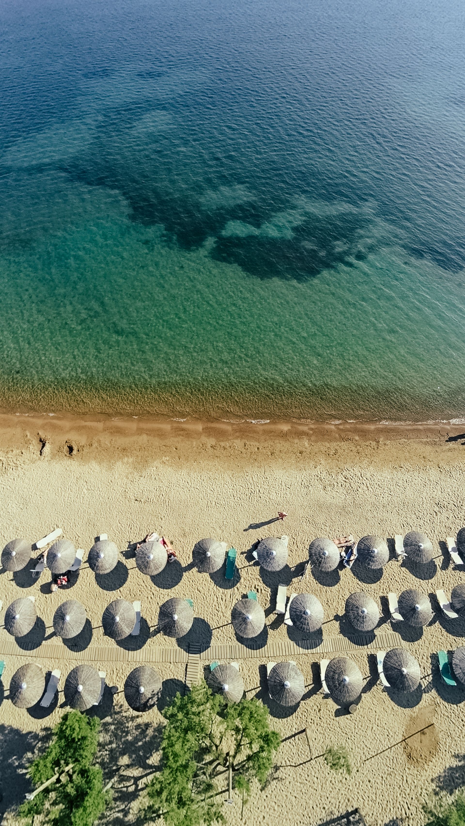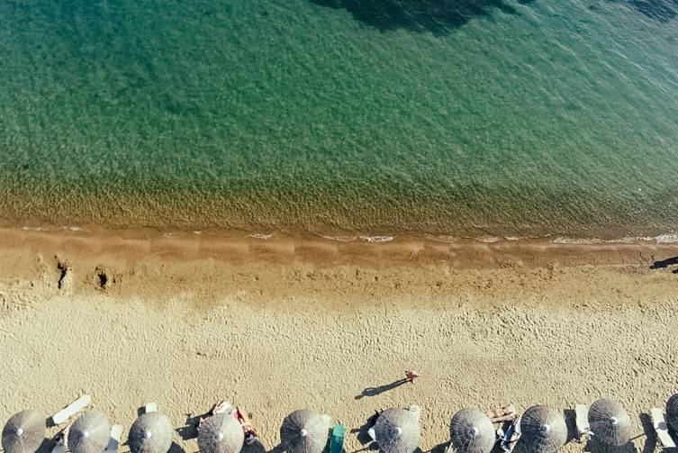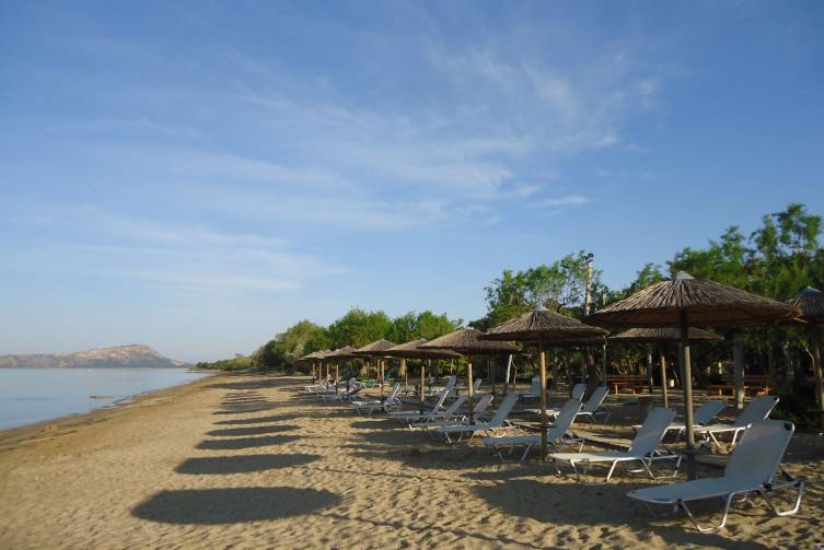 direkt am Strand von Gialova in der Navarino Bay, grobsandig, Liegen und Sonnenschirme inklusive bei Konsumation; zur bekannten Bucht von Voidokilia nur ca. 9 km.