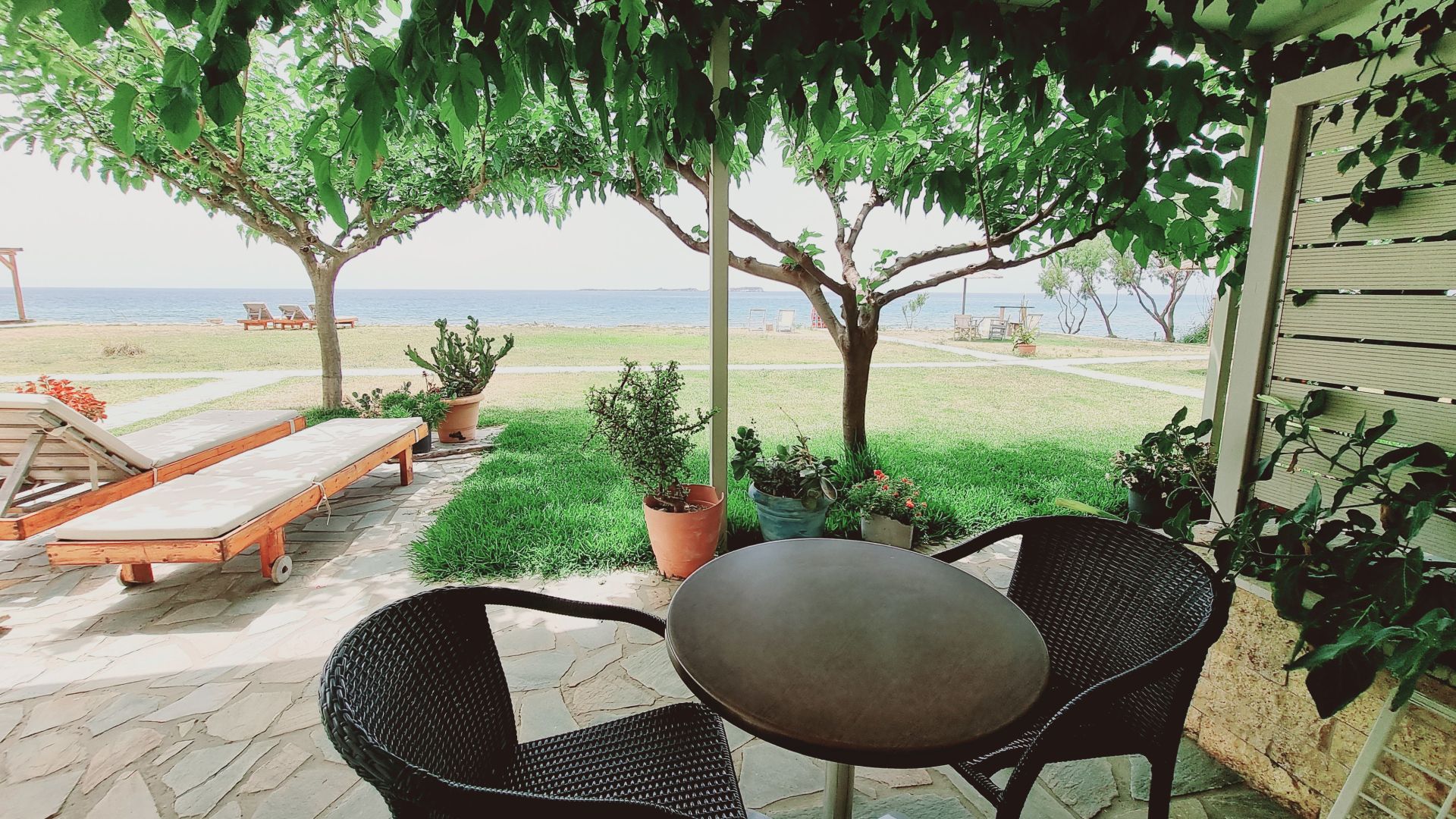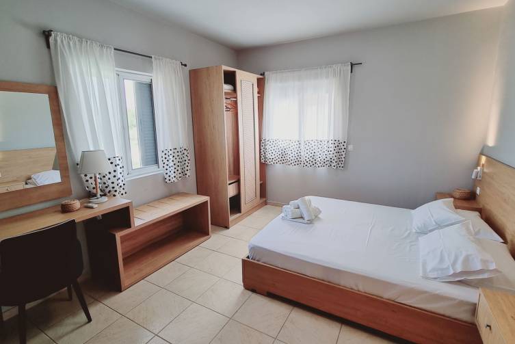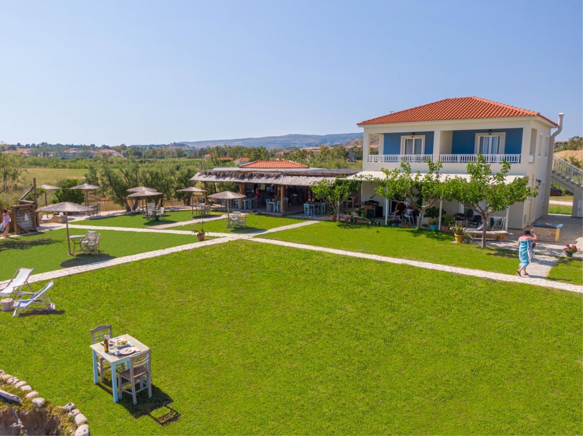 Bestehend aus 2 nebeneinander errichteten 1-stöckigen Gebäuden, direkt oberhalb des Xi-Beach, großzügiger Gartenbereich, seit 2017: eigenes à-la-carte Restaurant, Frühstücksterrasse, Parkplatz und W-Lan kostenlos.