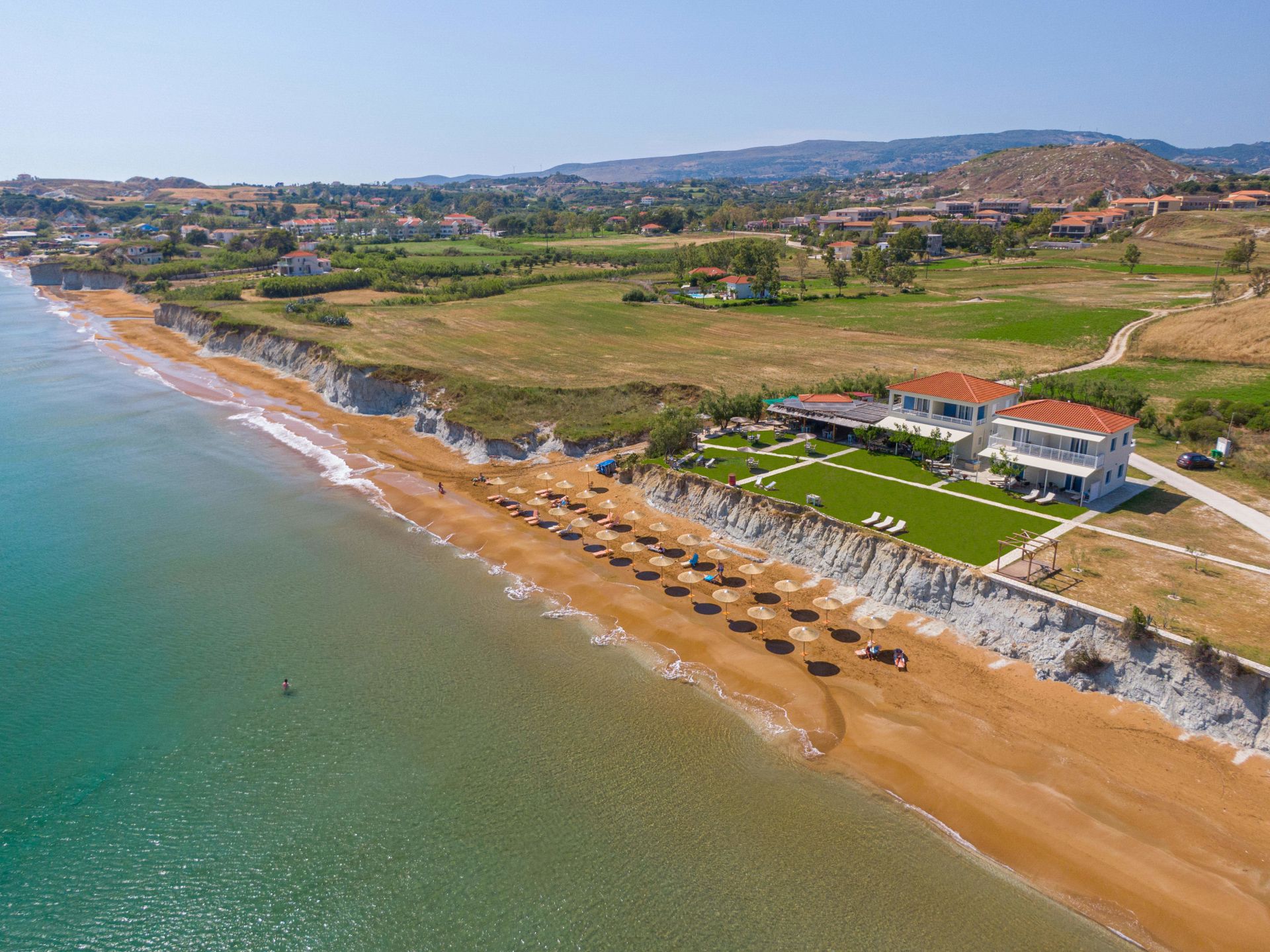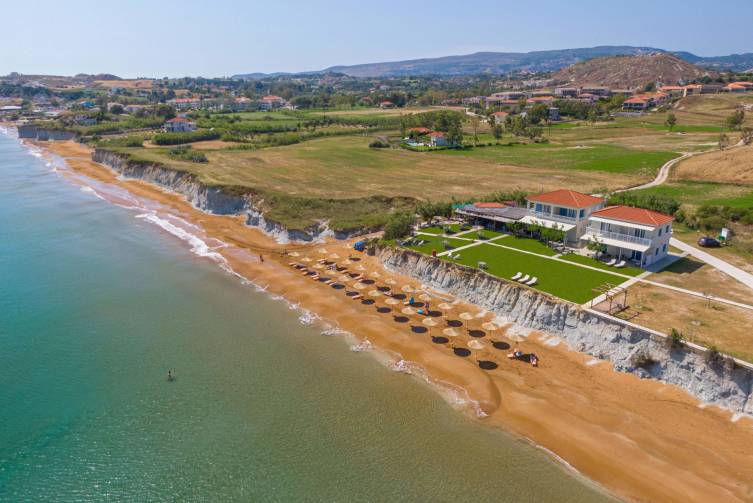 Direkt am Strand, am feinsandigen roten Xi-Beach, 2 Liegen und 1 Sonnenschirm pro Zimmer am Strand inklusive, der Strandabschnitt leigt abseits der öffentlichen Bereiche, dadurch ist dieser auch in der Hochsaison nicht überfüllt; bestens für Strandläuferinnen und Badebegeisterte geeignet, das Meer ist hier meist sehr ruhig und aufgrund seines seichten Einstieges auch schon im Mai erwärmt, in 500 m Entfernung, hinter einem Felsvorsprung, finden Sie Wassersportmöglichkeiten und Tavernen; Strandduschen vorhanden.