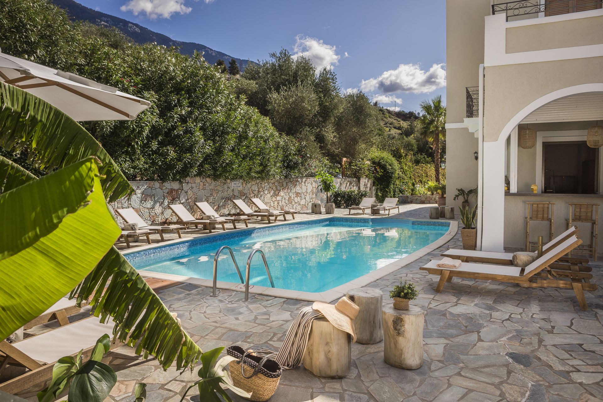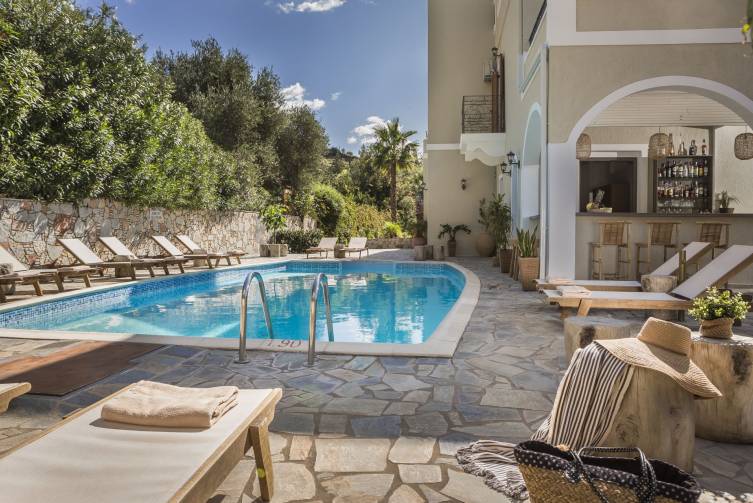 Das stilvolle Hotel befindet sich im charmanten Küstenort Lourdata im Süden der Insel. Eingebettet in die grüne Hügellandschaft genießen Gäste hier einen herrlichen Blick auf das Ionische Meer.