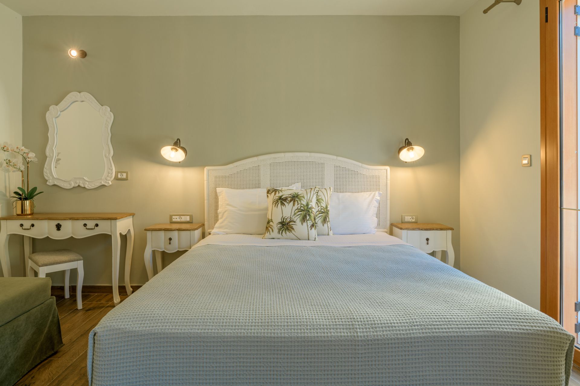 Doppelzimmer mit Doppel - oder Twinbetten, Dusche/WC, Föhn, Klimaanlage, Smart-TV, Telefon, Kaffee- und Teezubereitungsmöglichkeit, Safe, Mini-Kühlschrank, möblierter Balkon oder Terrasse, ca. 17 m²;