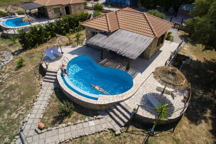 Villen im angrenzenden ca. 2.000 m² großen Garten, aus Stein erbaut mit viel Liebe zum Detail, ebenerdig, hochwertig möbliert und individuell eingerichtet, zahlreiche Tischlerarbeiten im Inneren mit künstlerischem Flair, Dusche/WC, Wohn-/Schlafraum, voll ausgestattete Küche mit Waschmaschine und Geschirrspüler, Wohnraum mit Sat-TV, 1 extra Schlafzimmer, Klimaanlage (inkl.), Privatpool und direkter Zugang zum Fluss und Sonnenterrasse, ca. 50 m²;