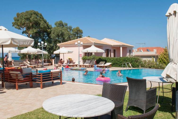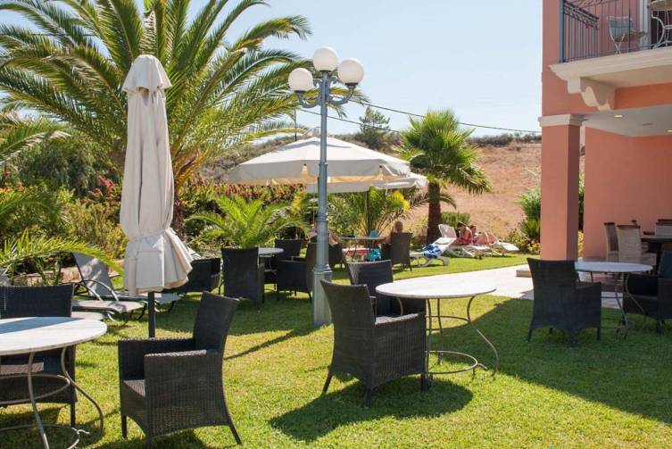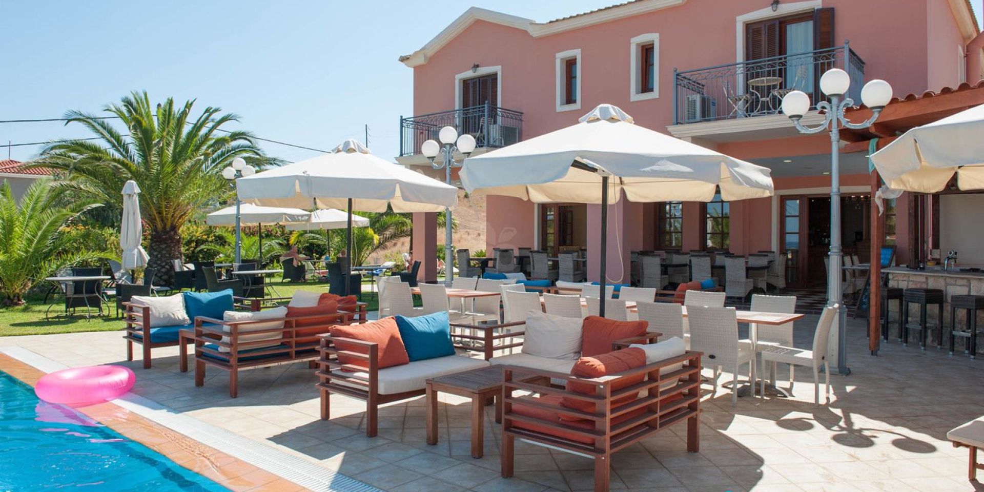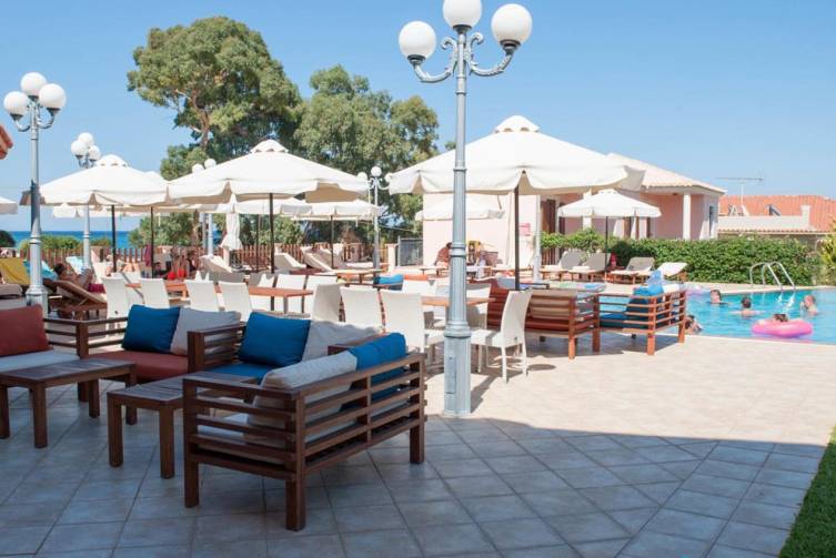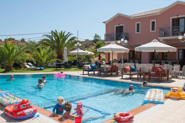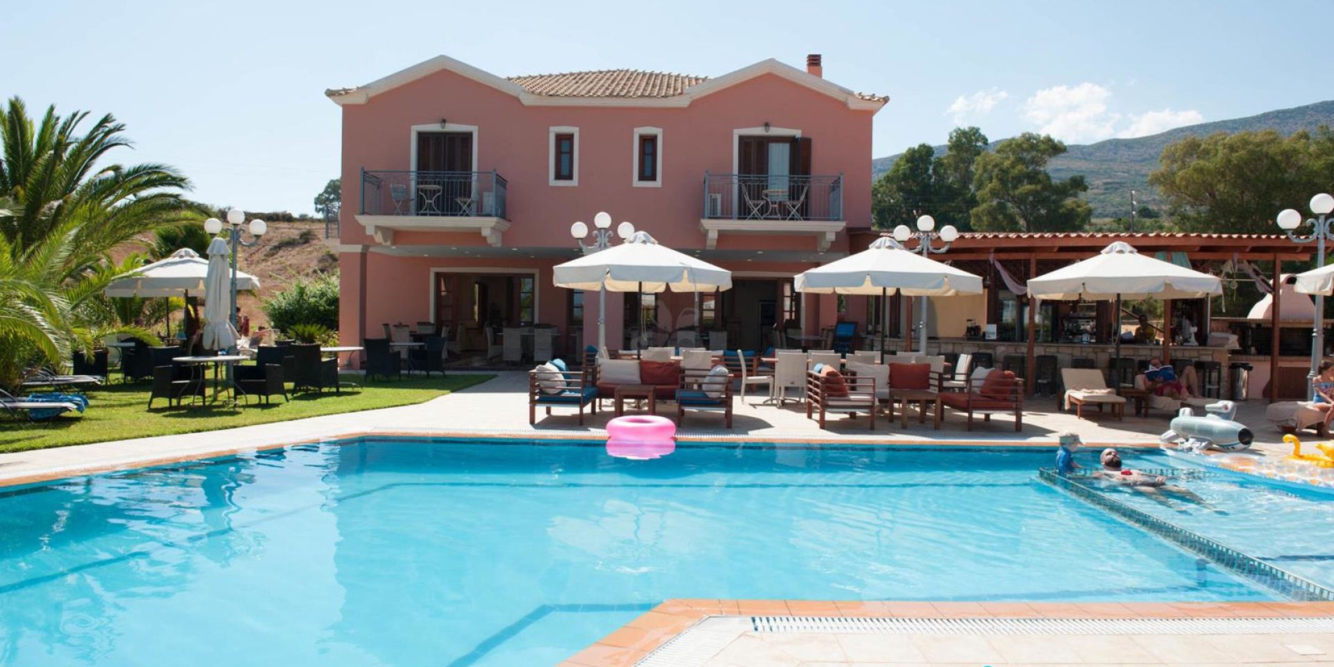 2-stöckiges Gebäude im mediterranen Stil, gepflegter Garten, Rezeption, Pool mit Kinderbereich, Poolbar, Liegen und Sonnenschirme sowie Pooltücher inklusive. W-Lan und Parkplatz kostenlos.