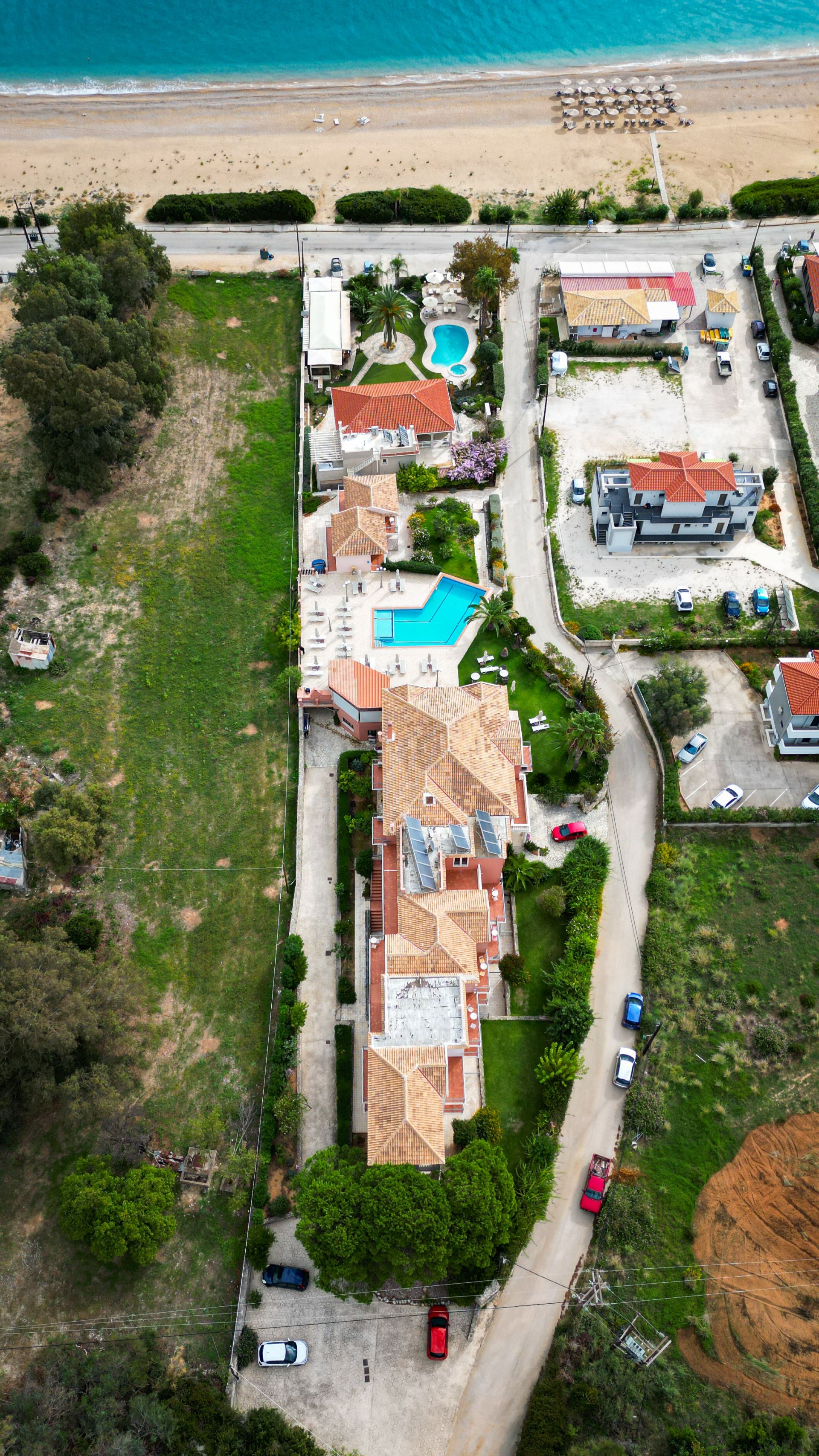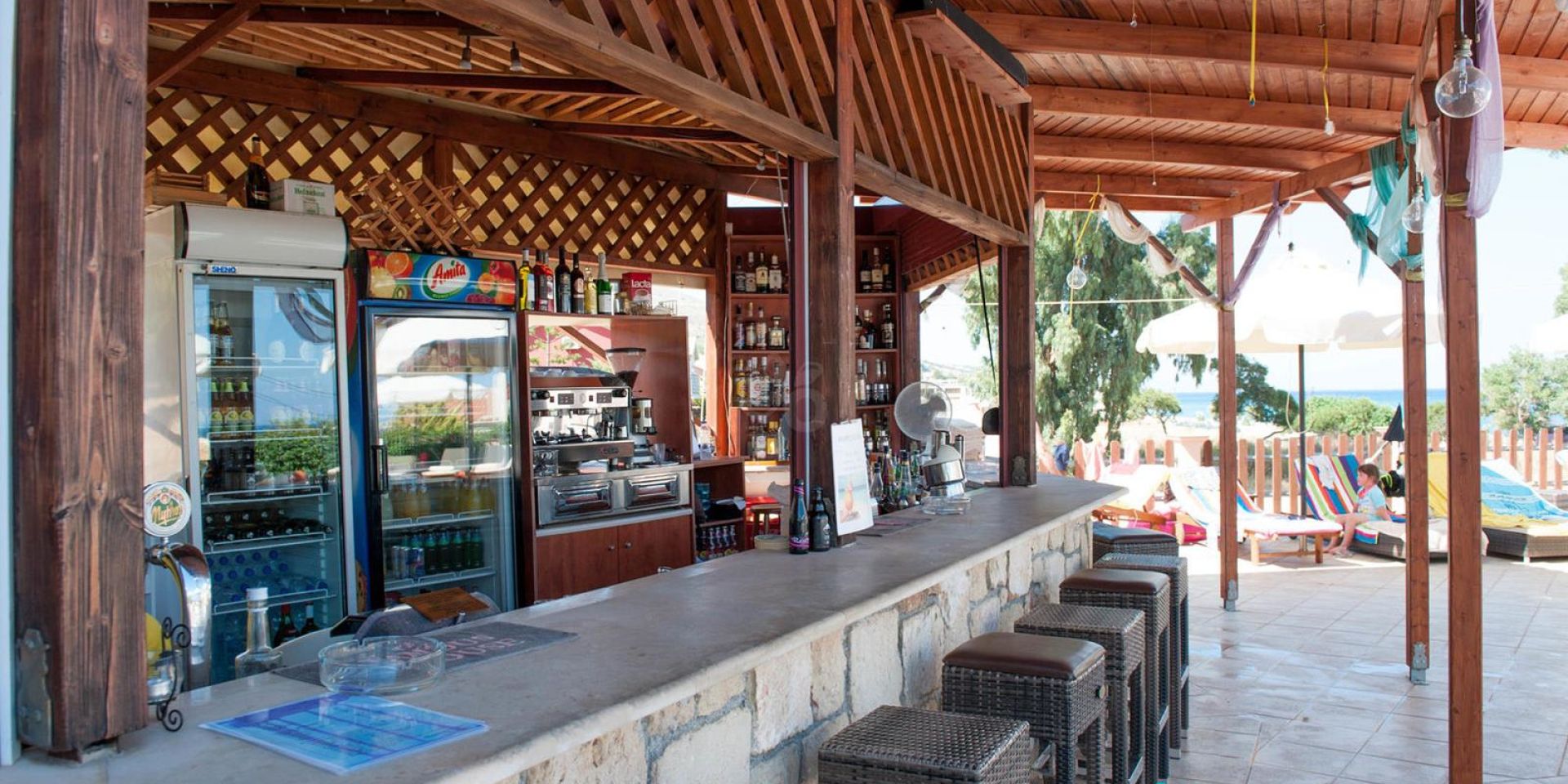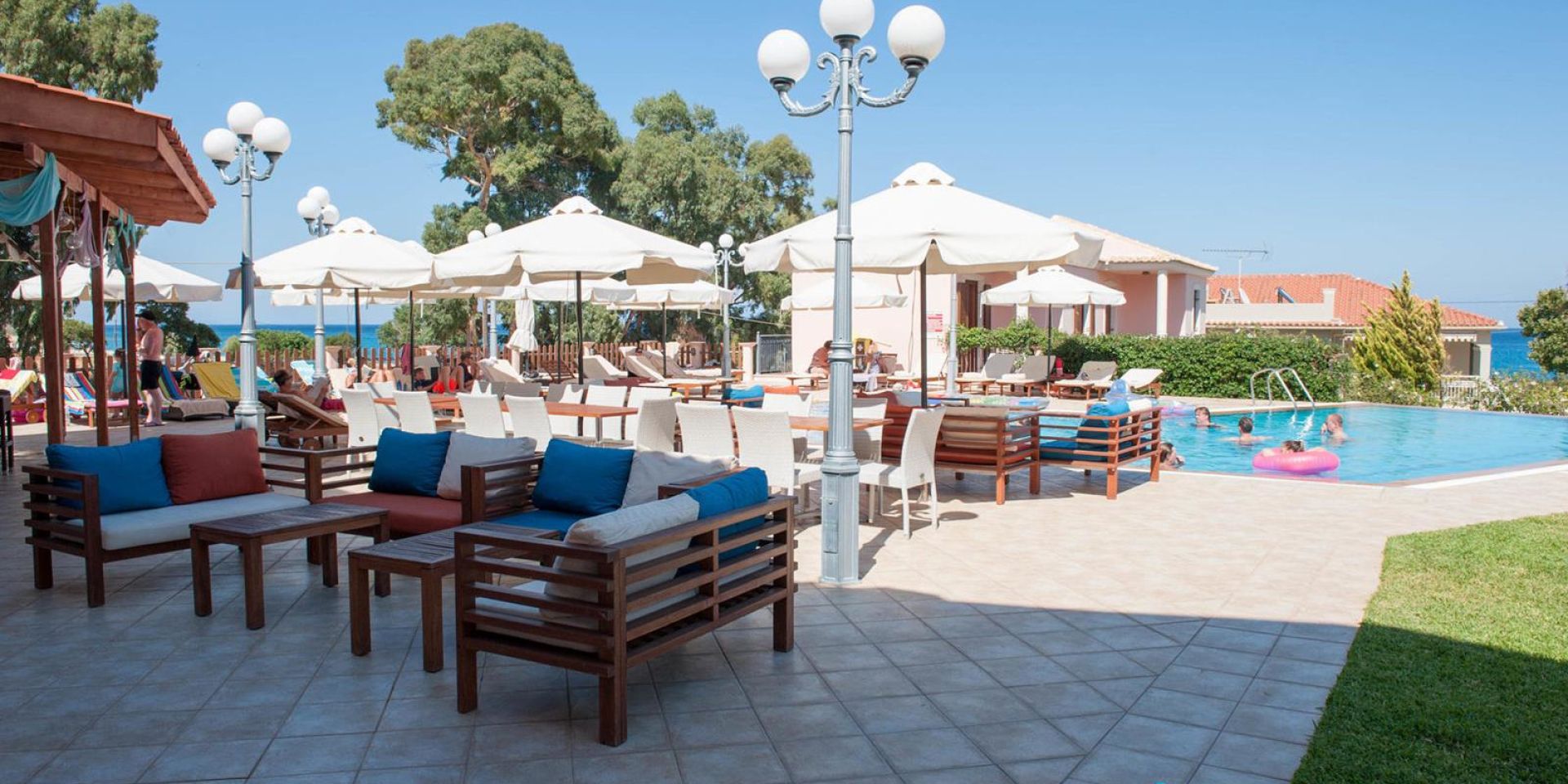 2-stöckiges Gebäude im mediterranen Stil, gepflegter Garten, Rezeption, Pool mit Kinderbereich, Poolbar, Liegen und Sonnenschirme sowie Pooltücher inklusive. W-Lan und Parkplatz kostenlos.