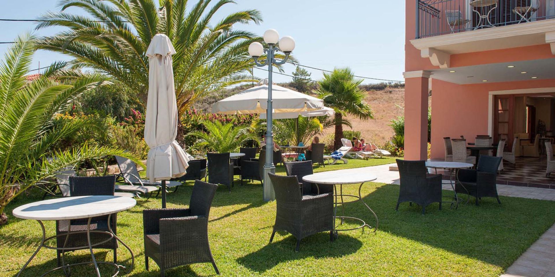 Doppelzimmer Terrasse: mit Dusche oder Badewanne / WC, Klimaanlage, Sat-TV, Telefon, Föhn, Safe, Kühlschrank, Kaffee- und Teezubereitungsmöglichkeiten, Schlafsofa und Terrasse mit Gartenblick;
