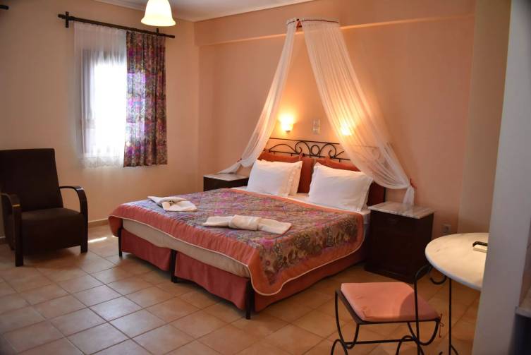 Das Hotel Melidron besticht durch seine warme, herzliche Atmosphäre, in der man sich sofort wohlfühlt. Genießen Sie griechische Gastfreundschaft in ruhiger Lage, nur wenige Schritte vom lebhaften Ort Skala gelegen. Der weitläufige, rund 5 km lange Strand liegt nur 50 m entfernt, das Dorf erreichen Sie in etwa 10 Gehminuten.