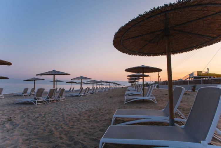 direkt am 5 km langen Sandstrand, flach abfallend, ideal für Familien; Liegen und Sonnenschirme gegen Gebühr (ausgenommen All Inclusive), Umkleidekabinen, Beachvolleyball, Strandtücher kostenlos.