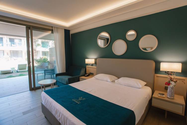Eingebettet in die grüne Landschaft des Nordens von Korfu und direkt am flach abfallenden Almyros Beach gelegen, empfängt Sie das moderne, familienfreundliche Hotel mit einem Hauch von griechischer Mythologie: Die 180 eleganten Zimmer verteilen sich auf zwölf Gebäude, benannt nach den Göttern des Olymps. Umgeben von Palmen, türkisblauem Meer und einer weitläufigen Gartenanlage erleben Sie hier eine Oase der Ruhe und Erholung.