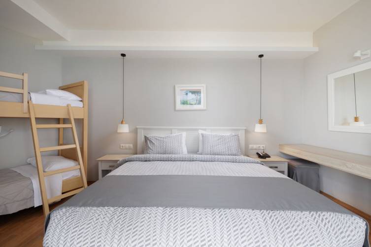 Vierbettzimmer Landblick wie Doppelzimmer Landblick mit zusätzlichem Stockbett für Kinder, Balkon der Terrasse, ca. 27 m²;