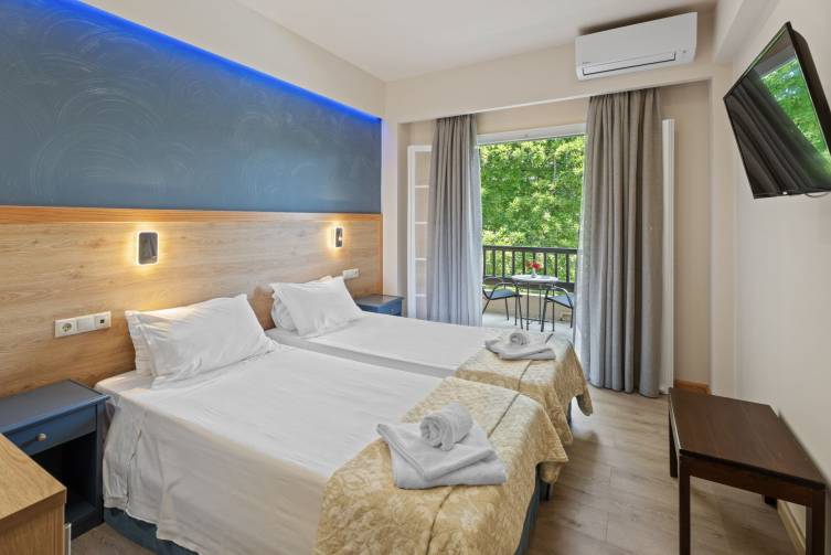 Doppelzimmer einfach aber komfortabel eingerichtet, Bad mit Dusche, Pflegeprodukte, Mini-Kühlschrank, Sat-TV, Klimaanlage, im Erdgeschoss oder 1. Stock gelegen, Balkon mit Garten- oder Poolblick, ca. 12 m²;