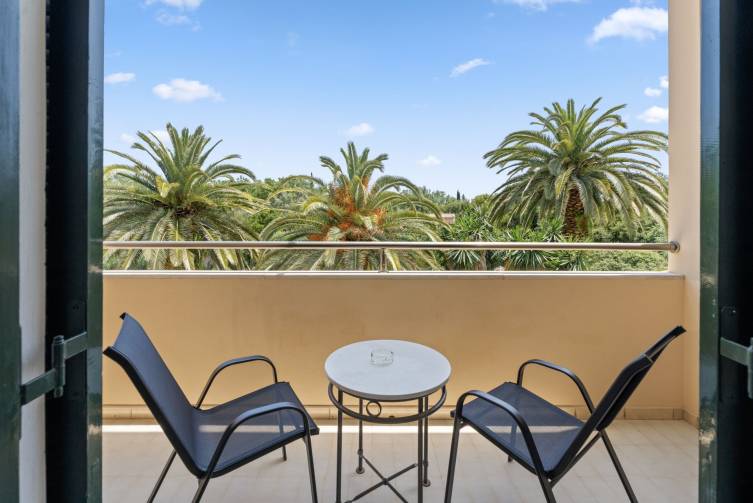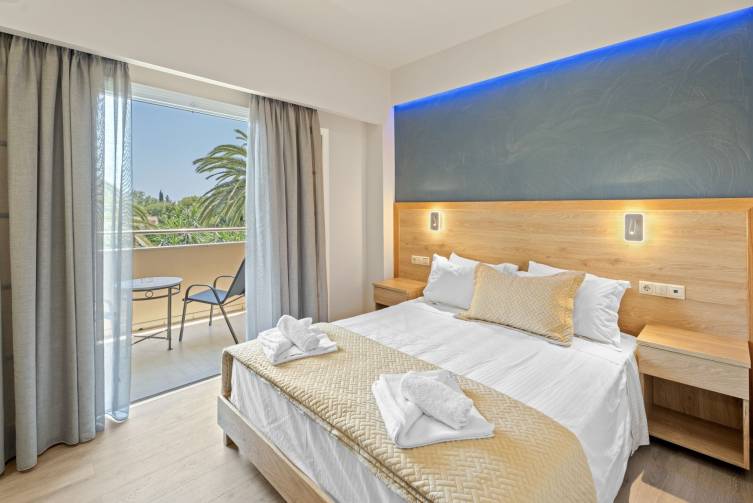 Doppelzimmer DeLuxe renoviert, mit Kingsize-Bett, im 3. Stock gelegen, Balkon mit Garten- oder Poolblick, ca. 12 m²;