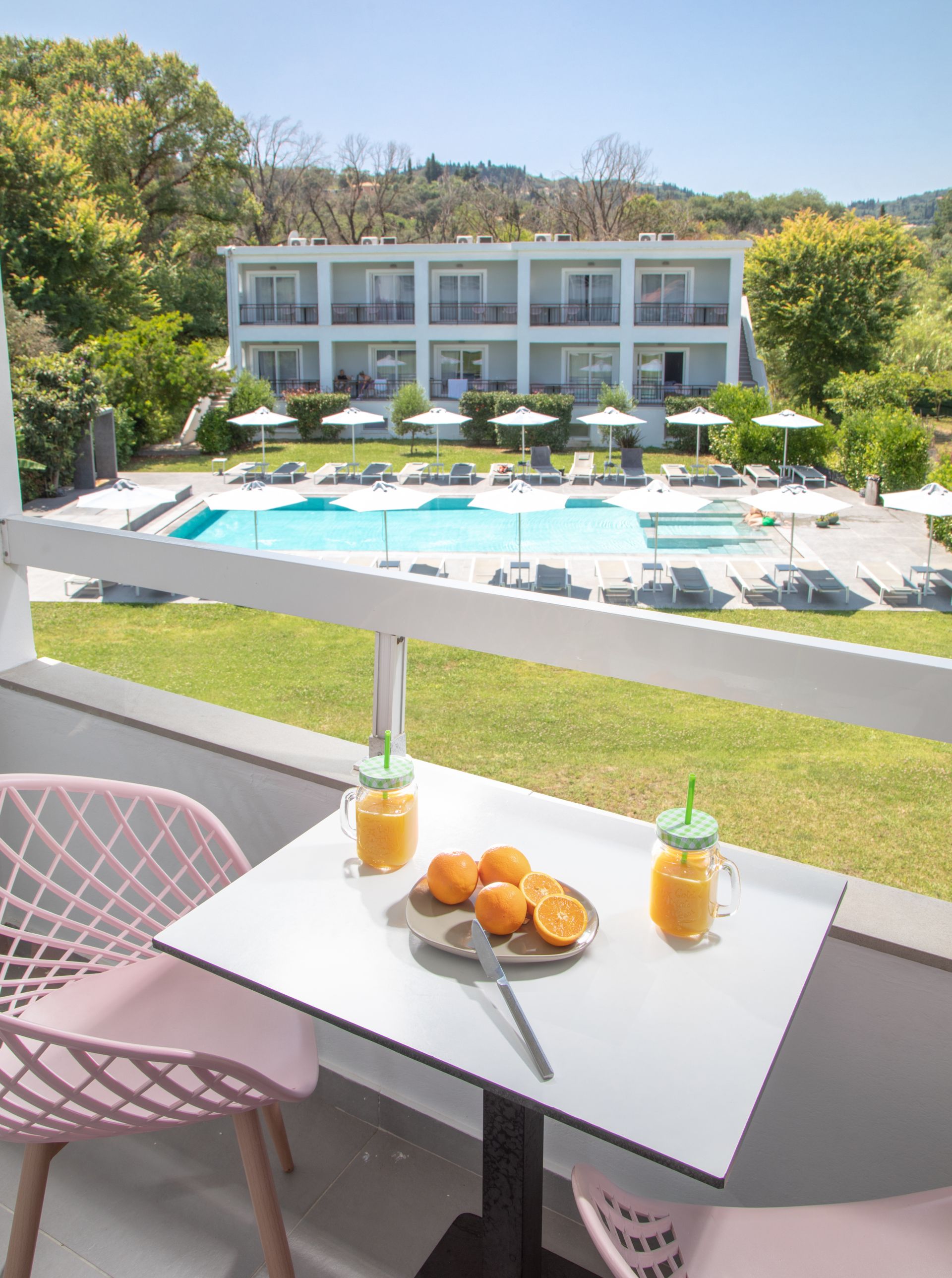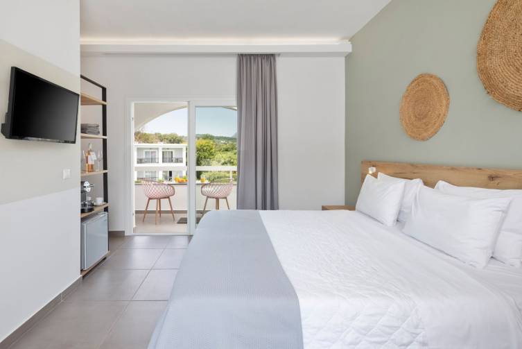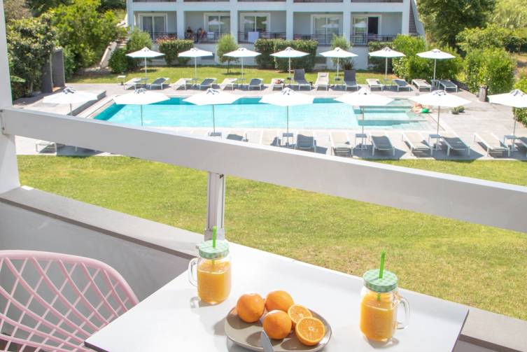 Doppelzimmer mit Dusche/WC, Föhn, Klimaanlage, Sat-TV, Safe, Kaffee- und Teezubereitungsmöglichkeiten, Minibar, Balkon oder Terrasse, Poolblick, ca. 24 m²;