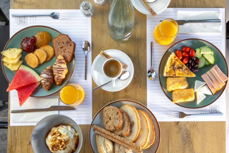 Frühstück: in Buffetform, umfangreiche Auswahl, Sitzplätze im Freien vorhanden; Mittagessen im à-la-carte Restaurant des Hotels möglich bis 15:30 Uhr möglich.