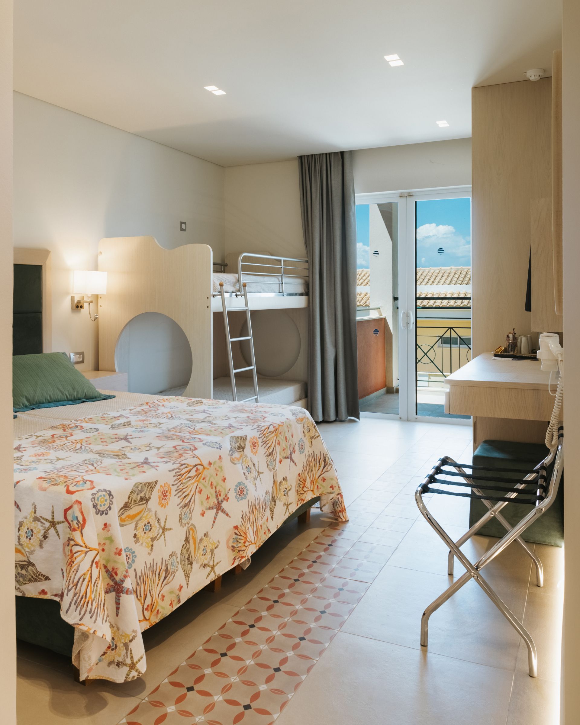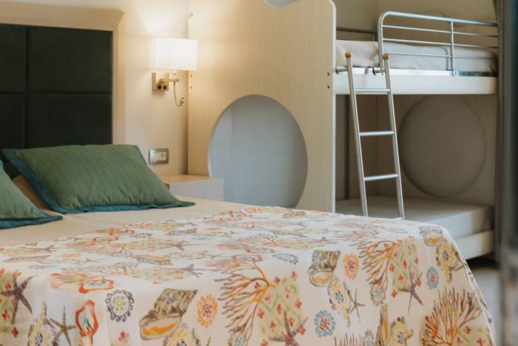 Vierbettzimmer: für bis zu 2 Erwachsenen mit 2 Kinder, Doppelbett und Stockbett im Zimmer, ansonsten gleich ausgestattet wie Doppelzimmer mit Gartenblick, ca. 30m²;