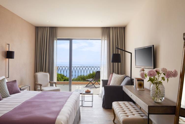 Juniorsuite Meerblick geräumig und elegant, Doppelbett, Dusche/WC, Föhn, Sofa, Sat-TV, Kaffee- und Teezubereitungsmöglichkeit, Safe, Minibar, Balkon mit Meerblick, ca. 30 m²;