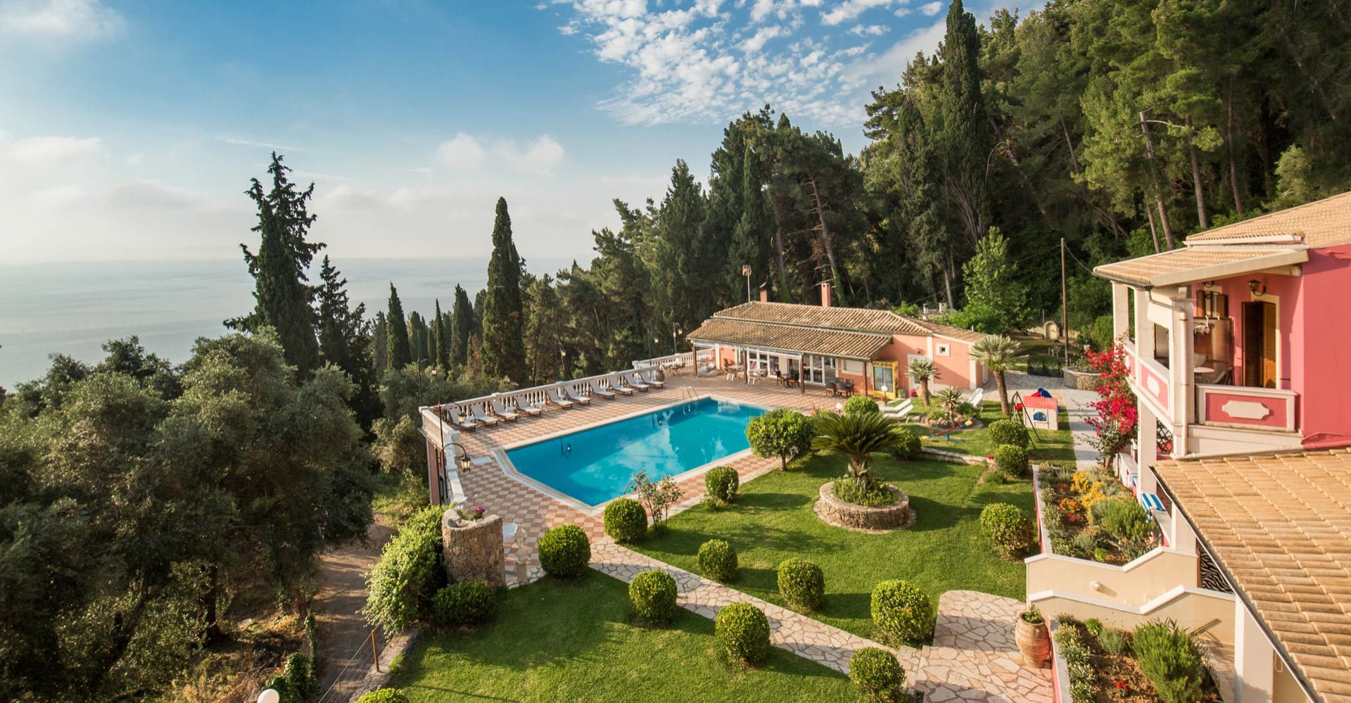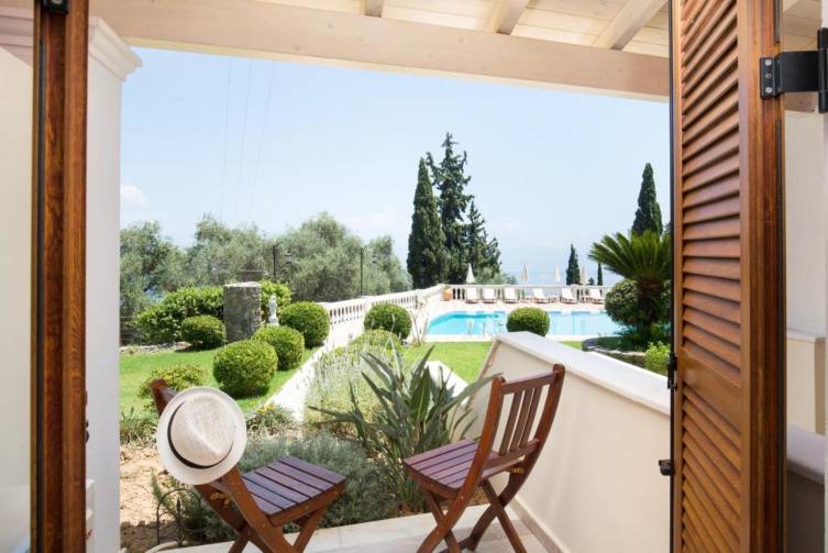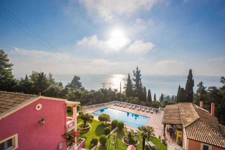 in leichter Hanglage in Achilleion; ca. 4 km nach Pontikonisi, 8 km nach Korfu Stadt; Transfer Flughafen - Hotel ca. 30 min. im inkludierten Mietauto.