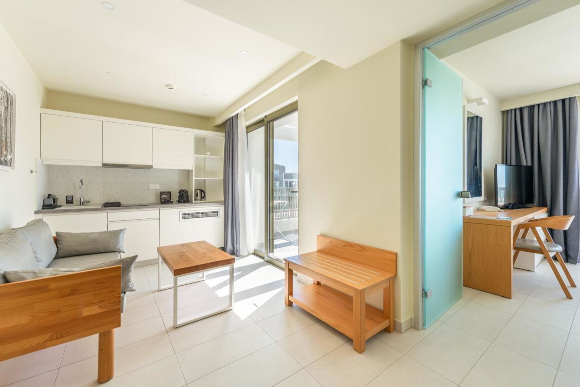Premium Suite mit 2 separaten Schlafzimmern (1x im Obergeschoss), Bad mit Dusche, Föhn, Safe, Mini-Kühlschrank, Kaffee- und Teebereitungsmöglichkeit, Kitchenette, Klimaanlage, TV, im 1. Stock, Terrasse mit seitlichem Meerblick, ca. 70 m²; Kinder bis 1,9 Jahre kostenlos.
