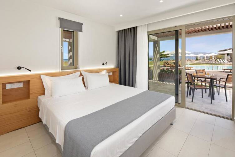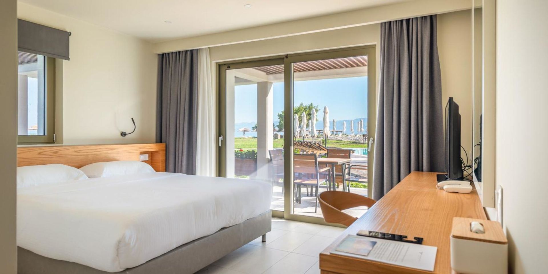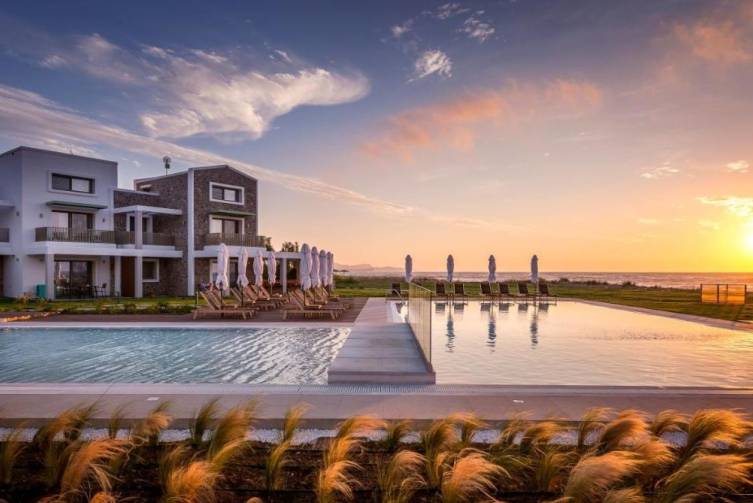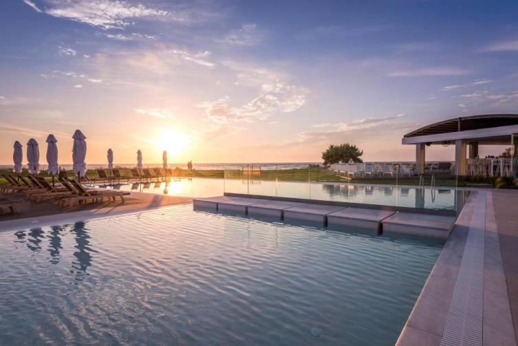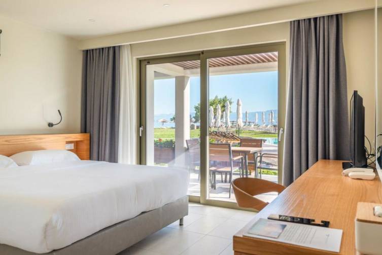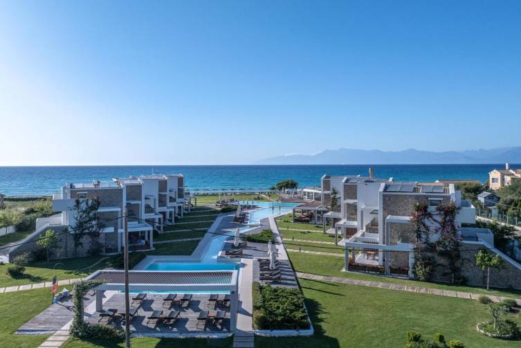 direkt am Almiros Beach, 8 km langer Sand-/Kiesstrand, flach abfallend, ideal für Familien; in der Hochsaison diverse Wassersportmöglichkeiten durch Drittanbieter (gegen Gebühr); Liegen und Sonnenschirme inklusive.