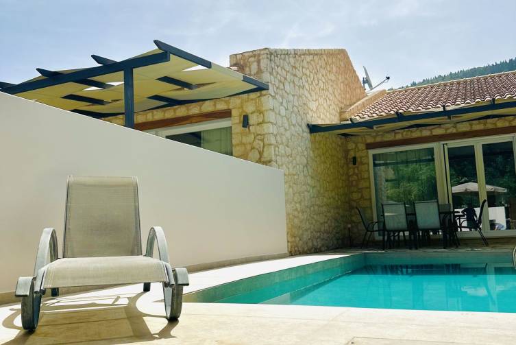 2 Villen mit Privatpool: im Maisonette-Stil mit Sichtdachstuhl, hell und sehr geräumig, im unteren Geschoss Wohnzimmer mit Schlafsofa, Sat-TV, Klimaanlage (inkl.), Essecke und vollausgestattete Küche mit Ofen, Herd, Kühlschrank, Wasserkocher, Kaffeemaschine und allen notwendigen Kochutensilien, Waschmaschine, 2 Badezimmer mit Dusche/WC, 1 Schlafzimmer mit Doppelbett (durch Tür getrennt), 1 Schlafzimmer oben mit 2 Einzelbetten (keine Tür), große überdachte Terrasse mit Möbeln und Sonnenliegen, Privatpool und großer Garten, Reinigung erfolgt alle 3 Tage, ca. 70 m²; Kinder bis 1,9 Jahre kostenlos in der Villa.