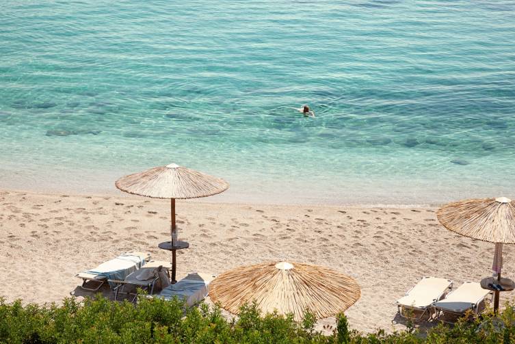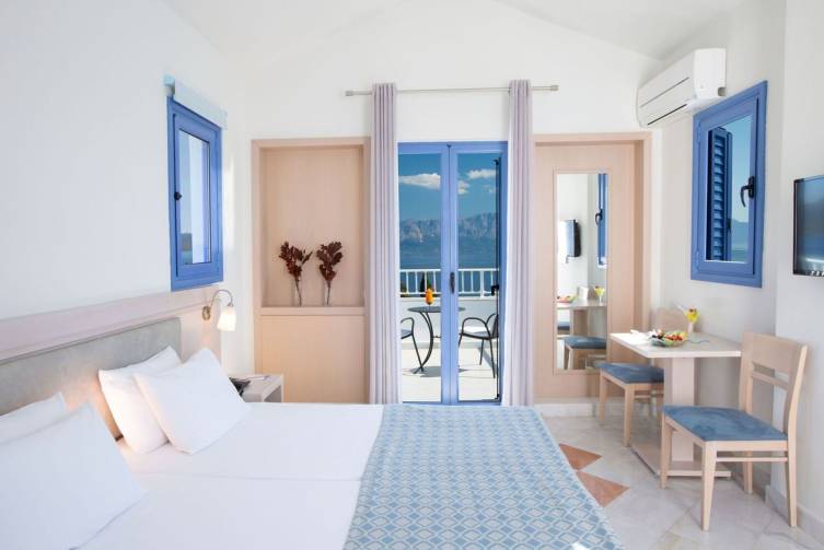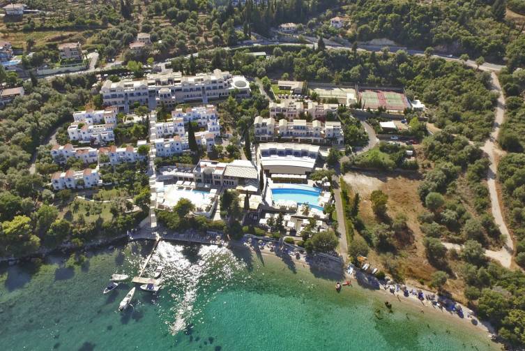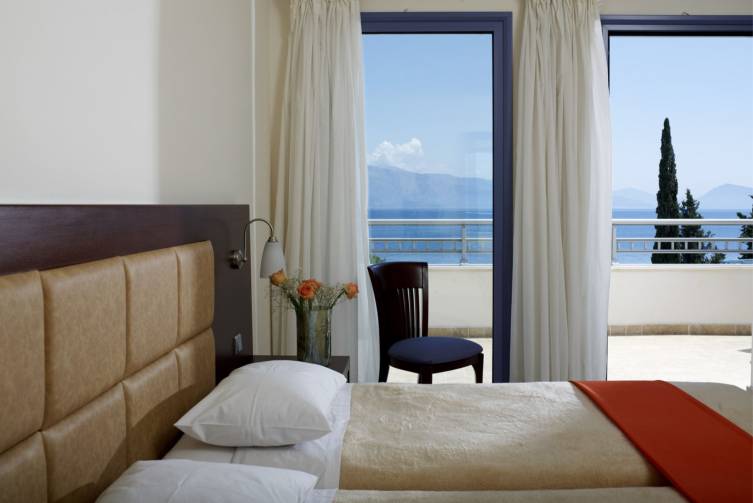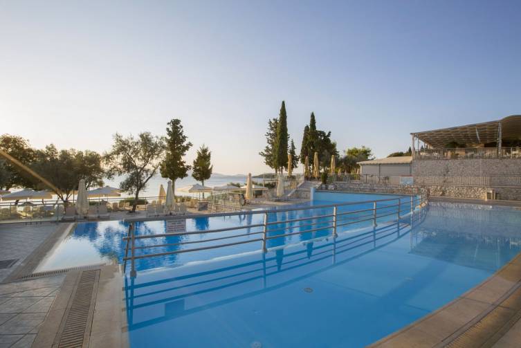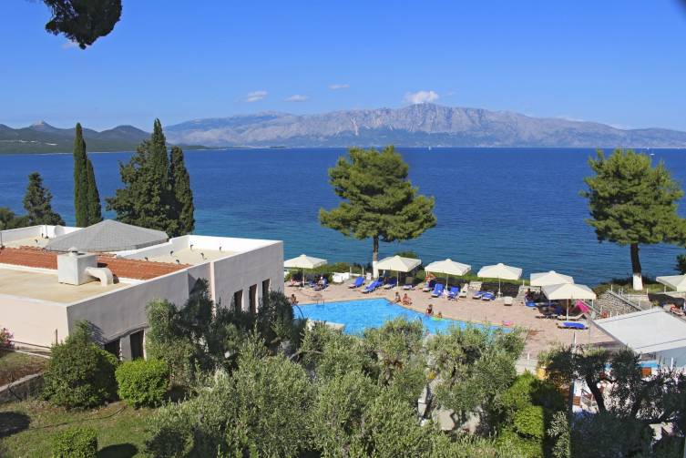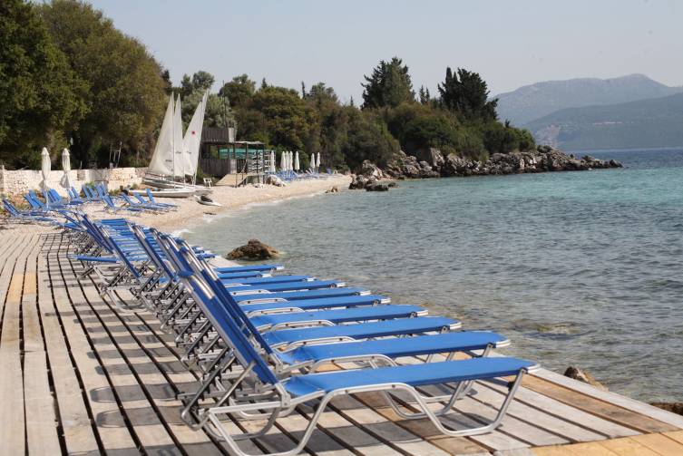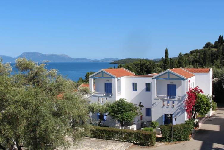ruhig am Meer, an der Ostküste der Insel, zwischen dem Ort Nikiana (3 km) und Nidri (4 km); nach Lefkas Stadt sind es ca. 12 km; Transfer Flughafen - Hotel ca. 45 min.