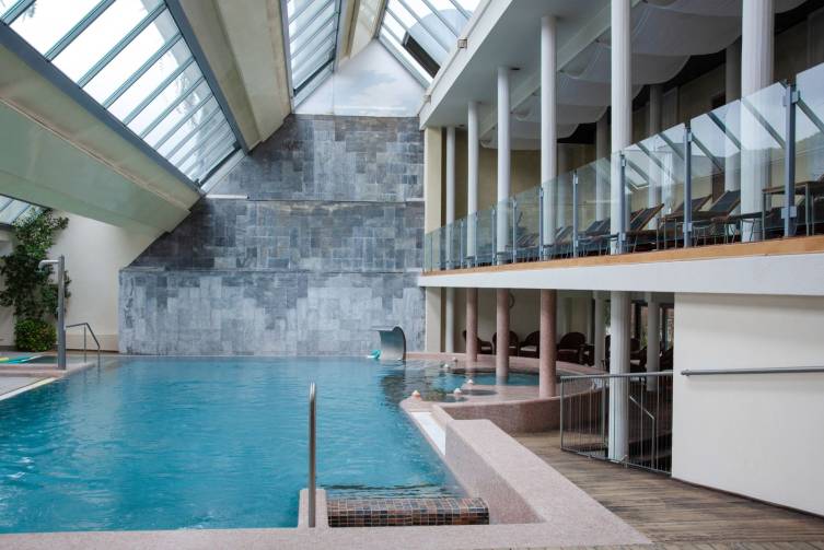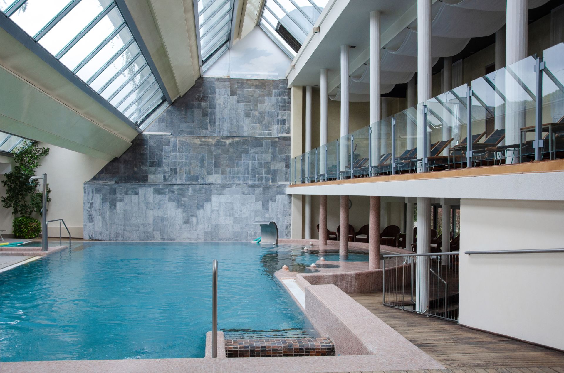 1 renoviertes Thermalhallen- (115 m²) und 1 Thermalfreischwimmbad (170 m²) miteinander verbunden (geöffnet von 08:00-19:30 Uhr, ca. 34-36 °C), ein 2. Außenbecken mit ca. 32 °C; Hydromassage, Kurabteilung unter ärztl. Leitung, Vital- und Spa-Bereich mit Salz-Relaxraum und separatem Ruheraum, Beauty Center; Sauna, Dampfbad, Schwitzgrotte, Kneippbecken; Eintritt zum neuen Emotion-Spa (nur Erwachsene): mit Panorama Sauna, Eisbrunnen, multisensorischer aromatisierter Erlebnisdusche;