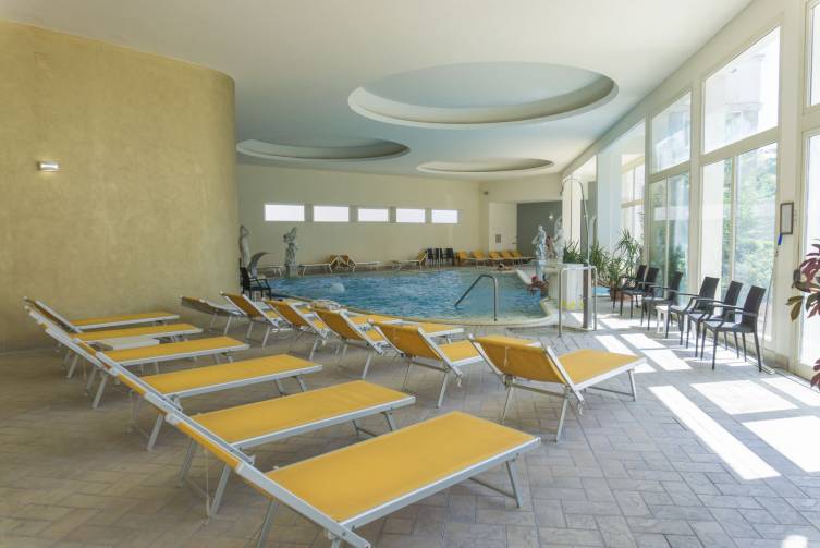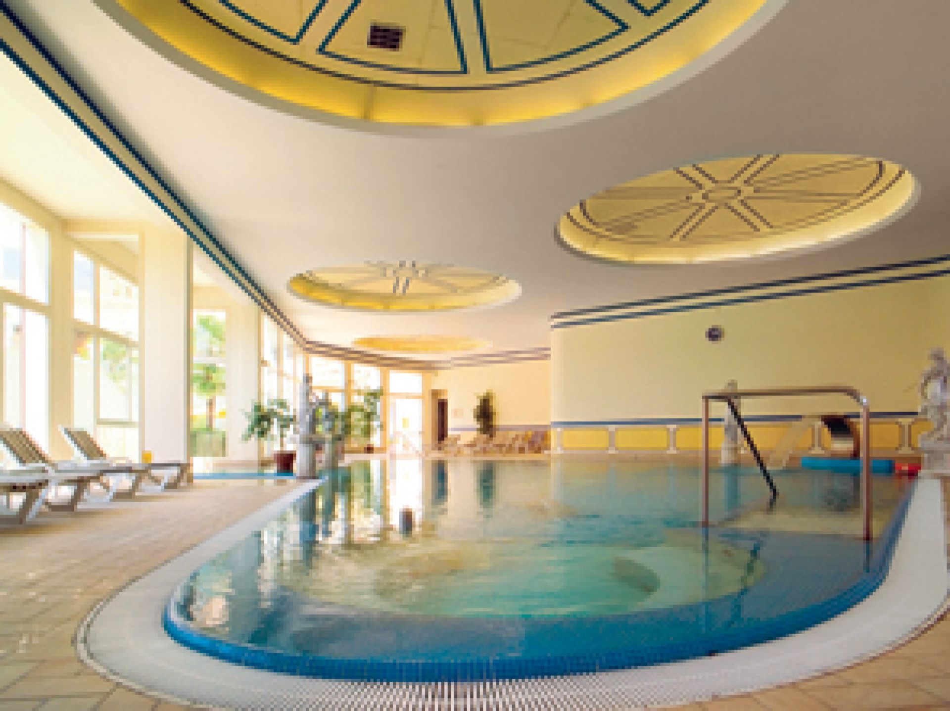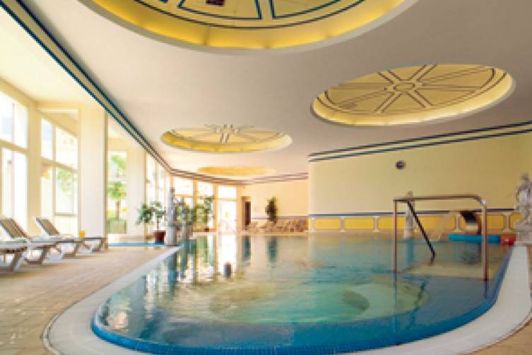 1 Thermalhallen- (ca. 50 m²) und 1 Freischwimmbad (ca. 150 m²) miteinander verbunden, mit Hydromassage (geöffnet von 08:00-19:00 Uhr & 20:00-23:00 Uhr, ca. 33-36 °C); Kurabteilung unter ärztlicher Leitung; Vital- und Spa-Bereich, Sauna kostenlos;