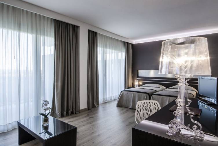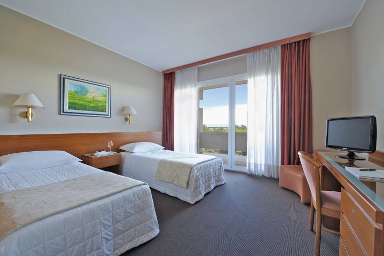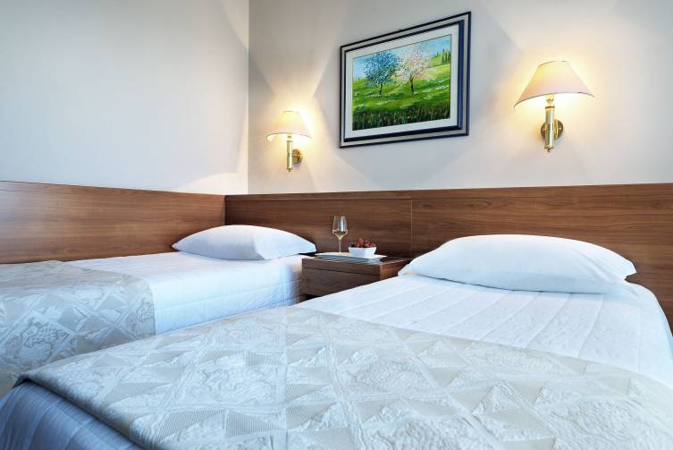 Einzelzimmer mit Badewanne oder Dusche/WC, Föhn, Telefon, Sat-TV, Safe, Minibar, Klima-anlage und Balkon, ca. 22-25 m²; barrierefreie Zimmer auf Anfrage verfügbar.