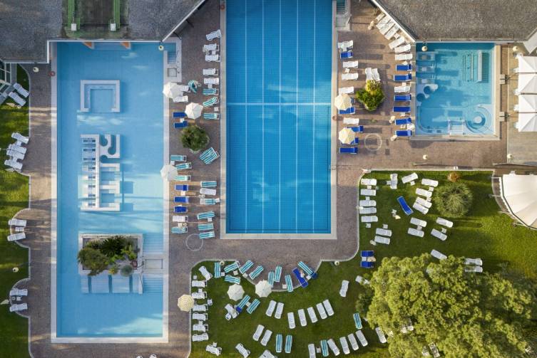 4 Thermalschwimmbäder (27-36 °C), davon 1 Hallenbad und 1 Olympisches Becken (28 x 12 m, ca. 30 °C), kleines Becken mit Sprungturm (4 m tief); Kurabteilung unter ärztlicher Leitung, Badehaubenpflicht; für die Benutzung der Thermalanlagen, der Sauna und des Türkischen Bades mit Erlebnisduschen ist eine
